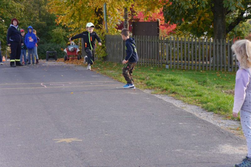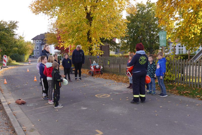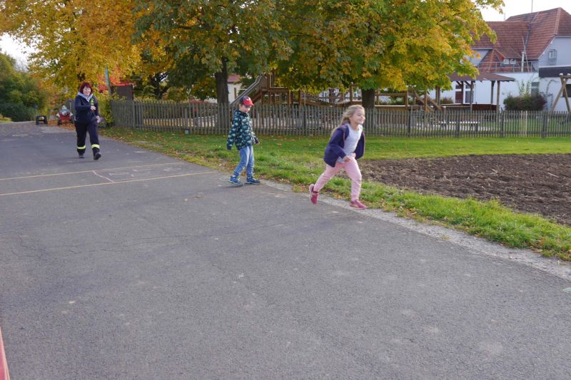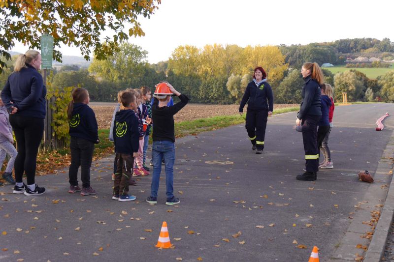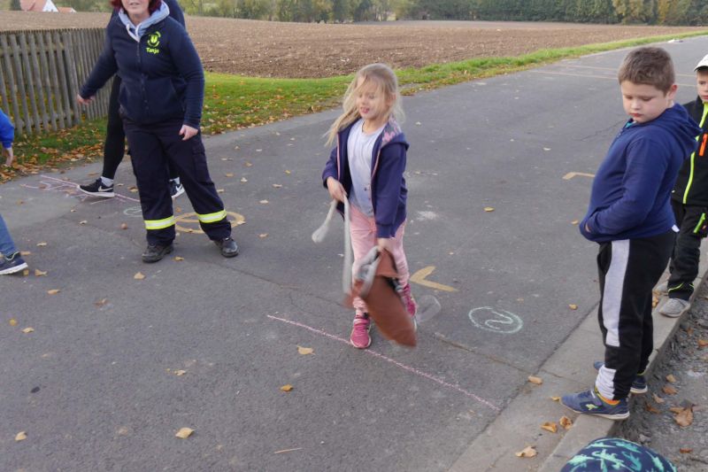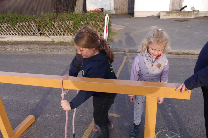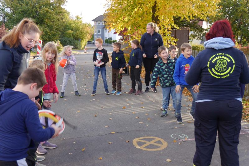 Zunächst haben wir ein Bewegungsspiel mit einem Helm gemacht. Dabei musste der Erste aus der Gruppe den Helm aufsetzen, an seiner Gruppe vorbeilaufen, sich hinten wieder anreihen und dann wurde der Helm schnell von allen Gruppenmitgliedern mit den Händen nach vorne zum Nächsten transportiert. Die schnellste Gruppe hatte gewonnen.