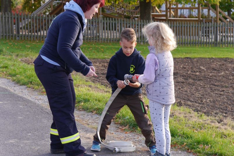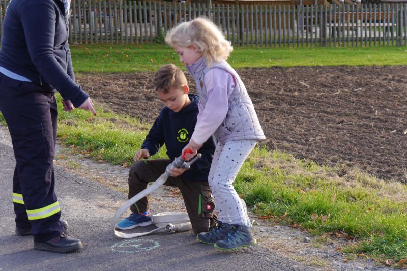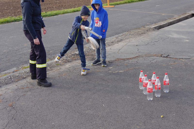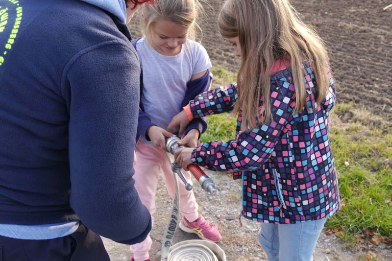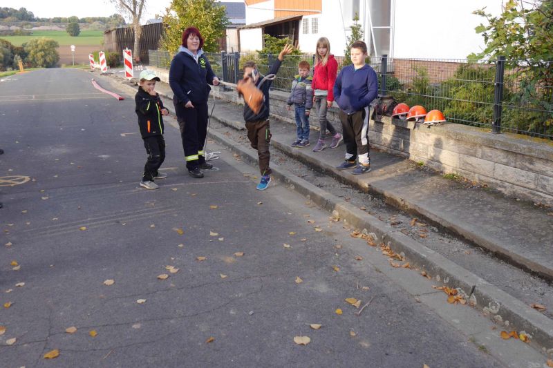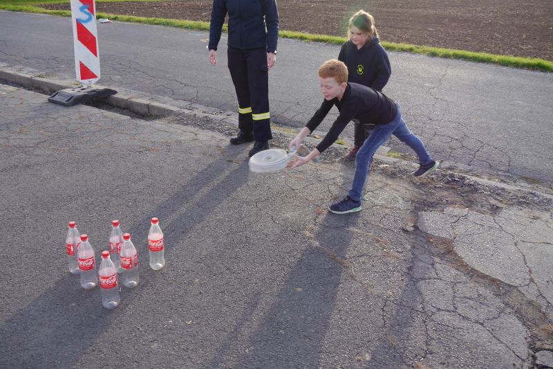 Danach haben wir eine Art Staffellauf mit verschiedenen Aufgaben gemacht. Jeder Läufer aus der Gruppe hatte zwei Aufgaben zu bewältigen, z.B. Springen über den Wassergraben, Schlauch und Strahlrohr miteinander verbinden, einen Knoten machen, Schlauch auswerfen etc. Dazu war Konzentration und Schnelligkeit gefragt.