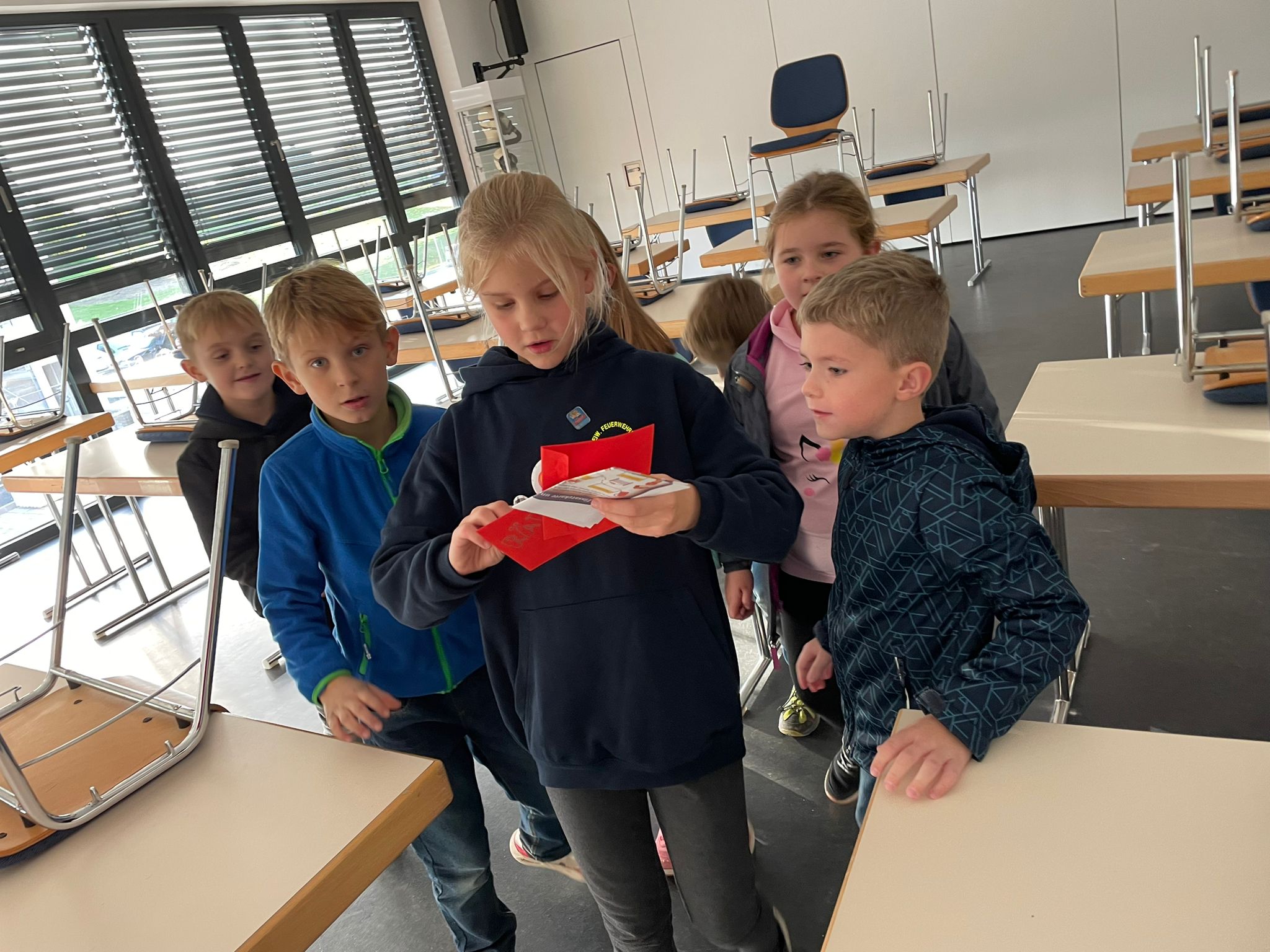 Wie z.B. wo die Hände nach einem Einsatz gewaschen werden, wo viele Feuerlöwenbilder hängen, wo es am kältesten in der Feuerwehr ist oder man solle bei den Feuerlöschern mal nachschauen,…