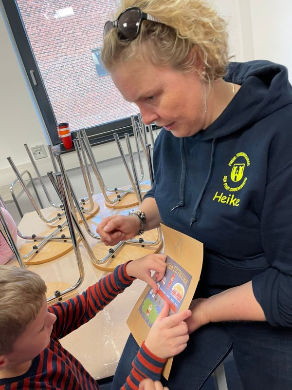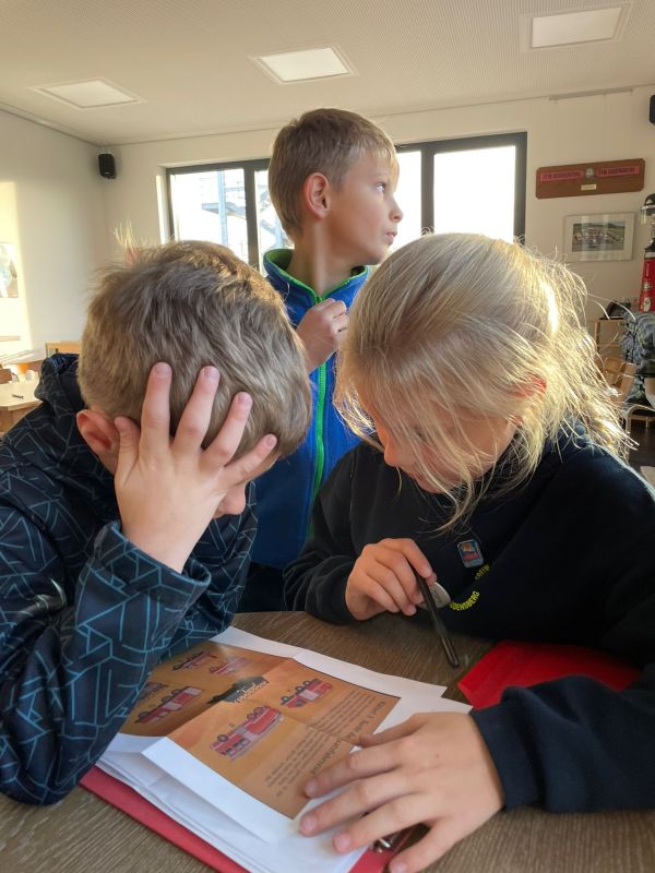 So ging es Kreuz und Quer durch das Gebäude, Treppe hoch und runter, zu den Büros, in die Fahrzeughalle, wieder hoch und nochmal runter, in die Umkleide,… bis alle Lösungssymbole auf der Einsatz- Schatzkarte eingetragen waren.