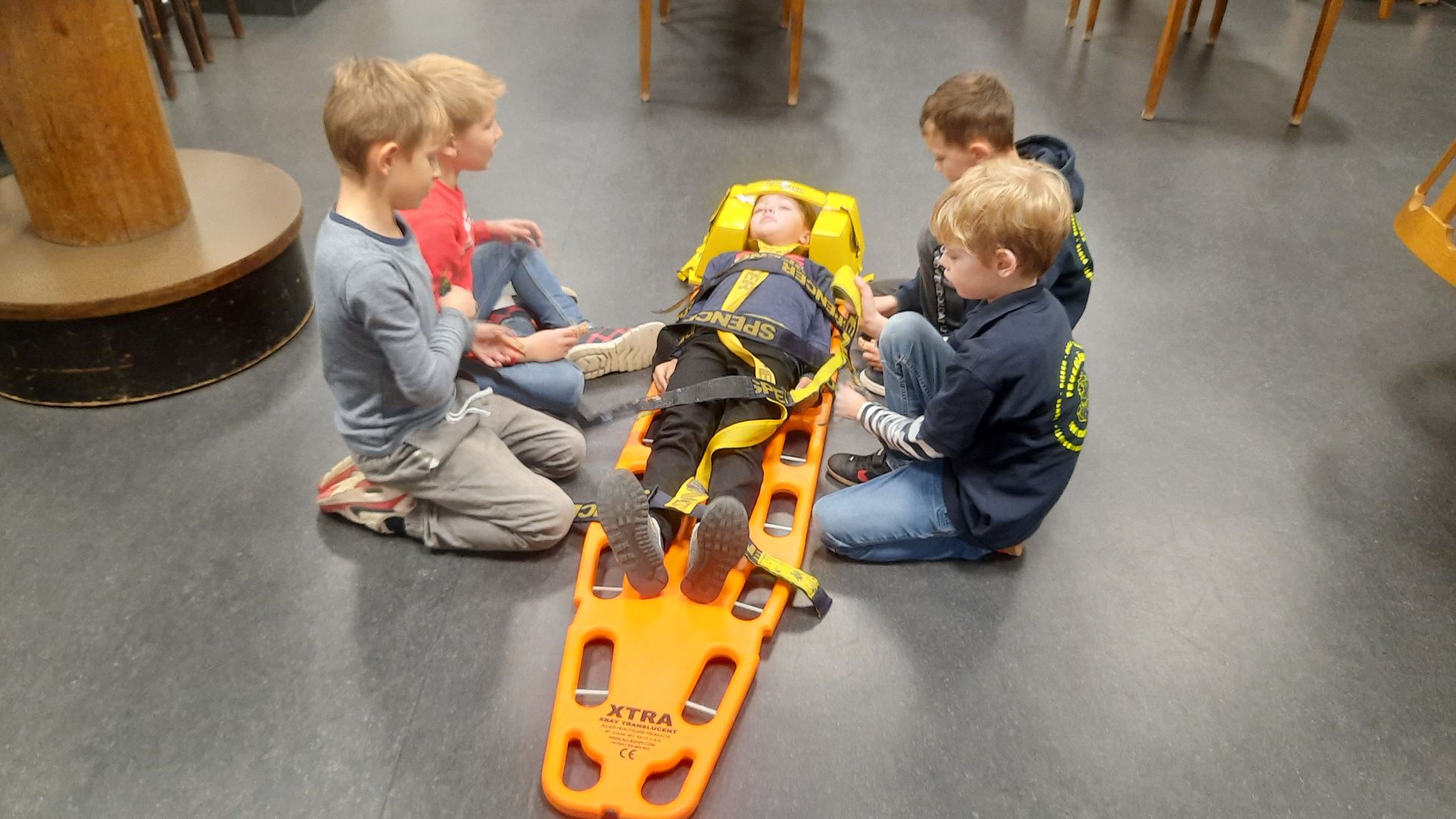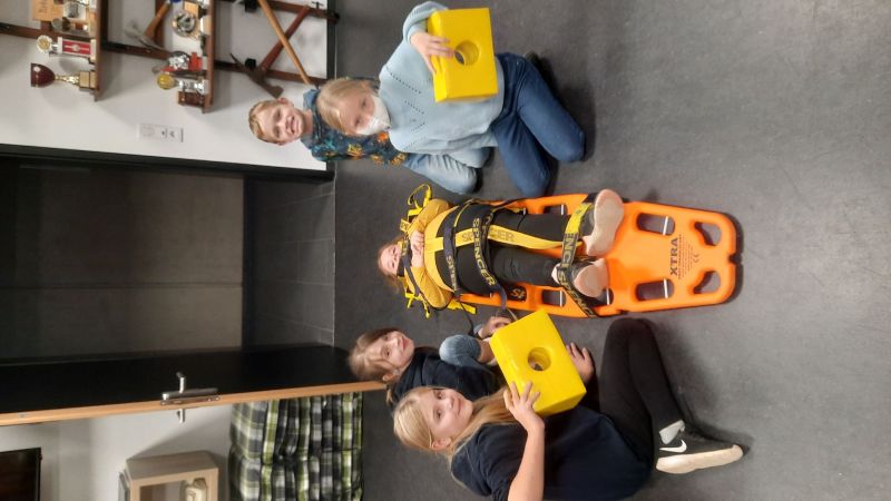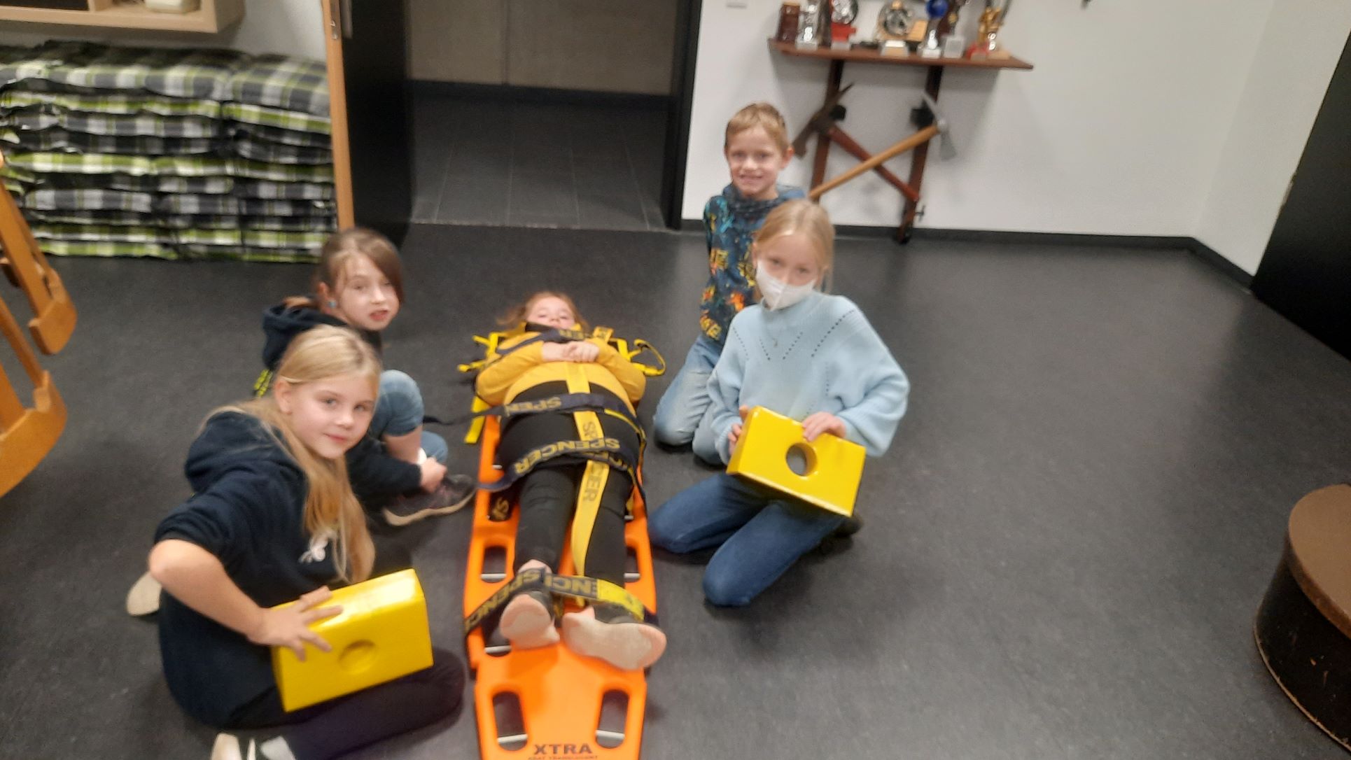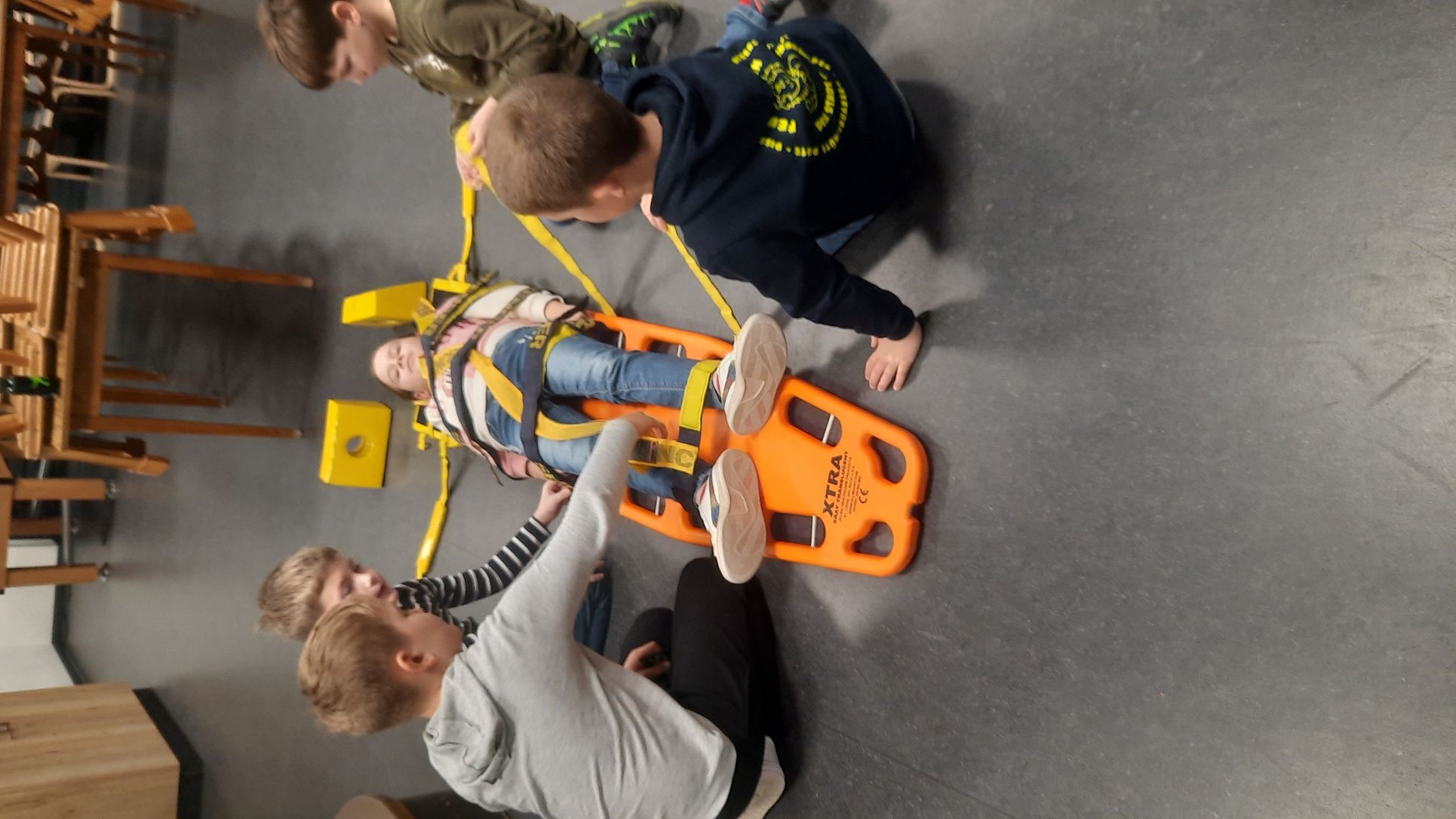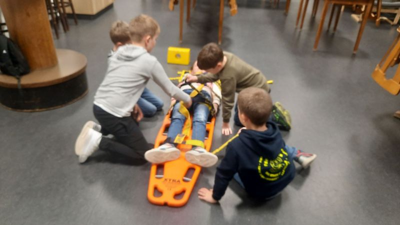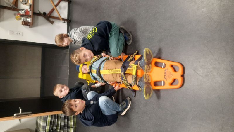 Danach ging es auf das Spineboard (Rettungsbrett) auch dies wurde mit seinen Einsatzmöglichkeiten erklärt und dann "die Spinne" (Bebänderung zum sichern) sortiert und angelegt…. und der Verletzte mit dem Kopf voran abtransportiert.