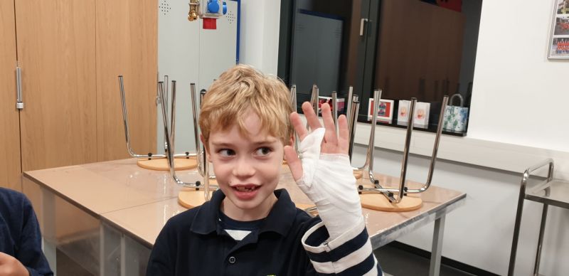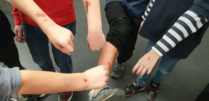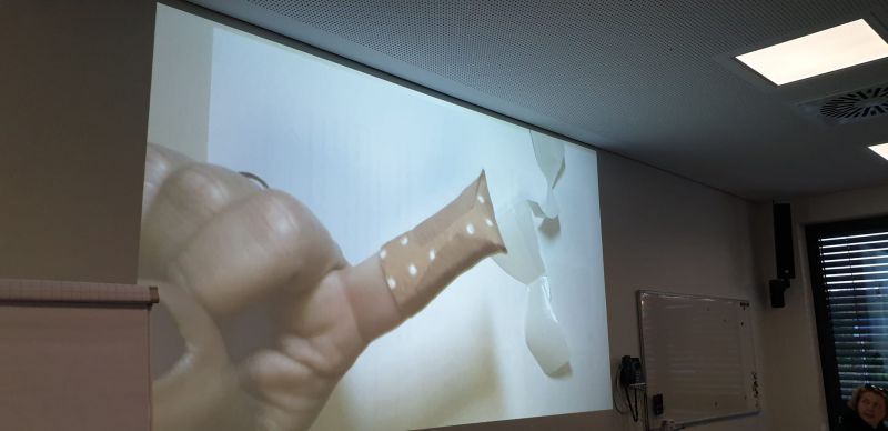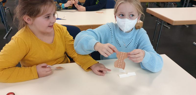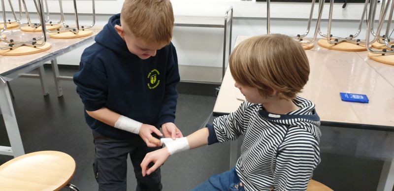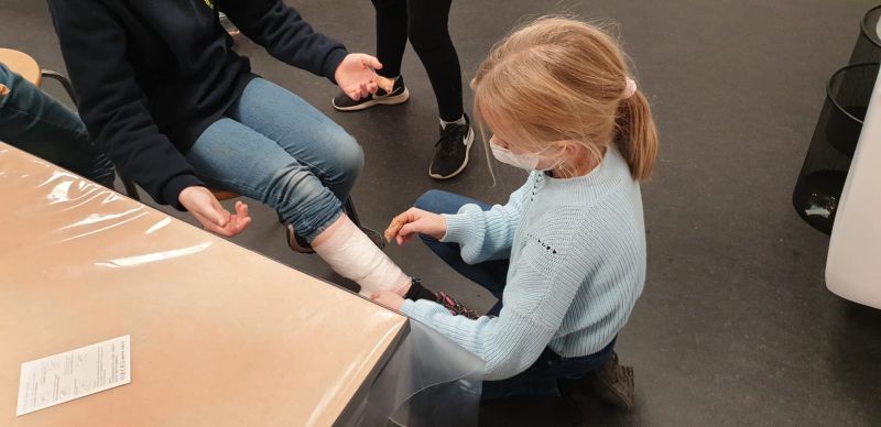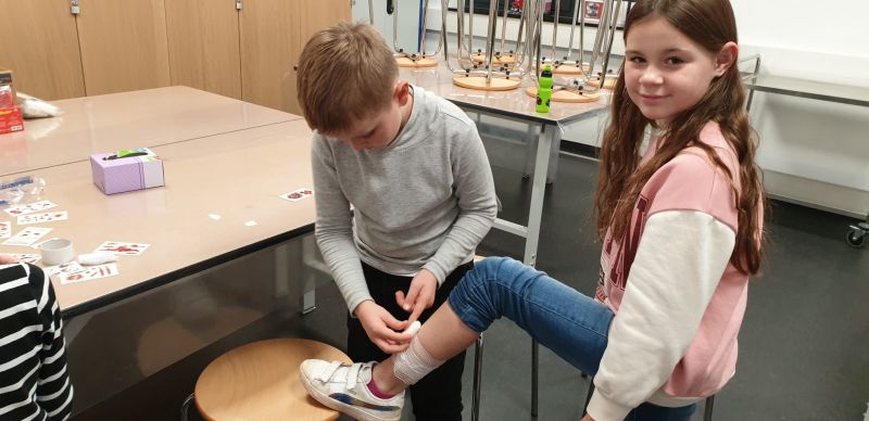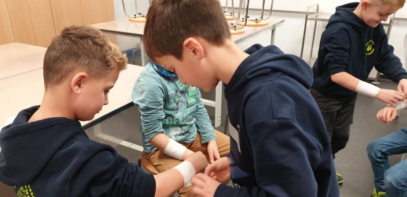 Ein Fingerkuppenverband wurde gegenseitig unter Anleitung angelegt und schon hatten alle ein schickes Pflaster am Finger.
