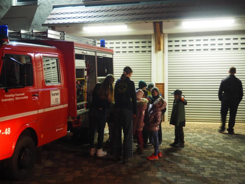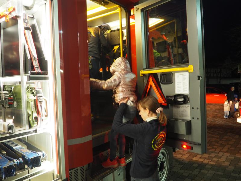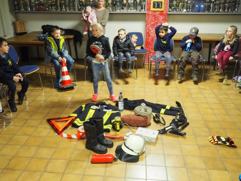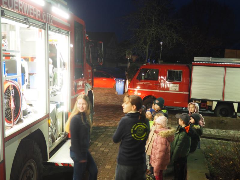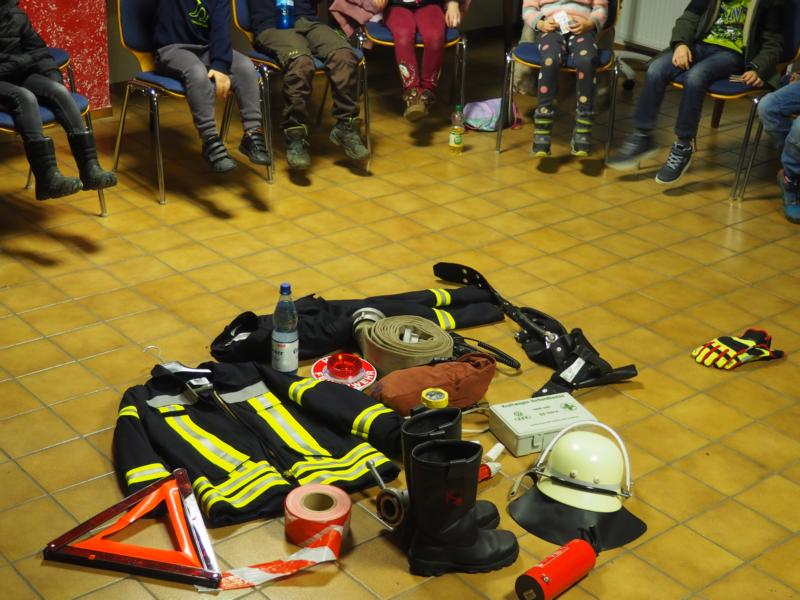 Selbstverständlich hatten die Kinder die Feuerwehrfahrzeuge vor dem Feuerwehrhaus gesehen und konnten es kaum erwarten, diese sich anschauen zu können. Aufgeteilt in zwei Gruppen wurden die Fahrzeuge besichtigt und das ein oder andere Teil herausgenommen und erklärt und jede Menge Fragen beantwortet, ehe die Mannschaftsräume besetzt wurden.