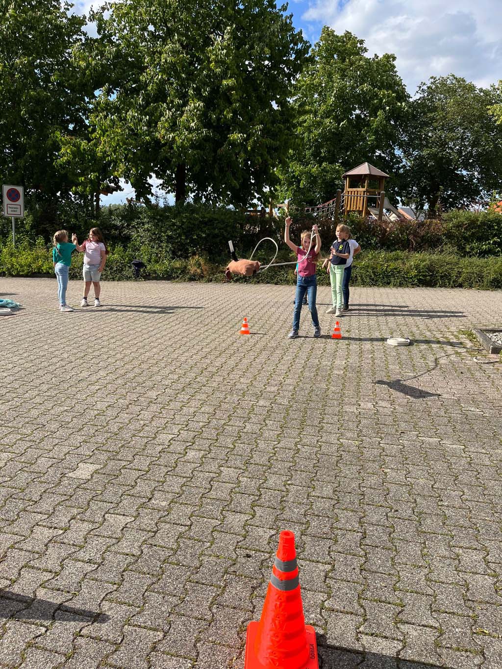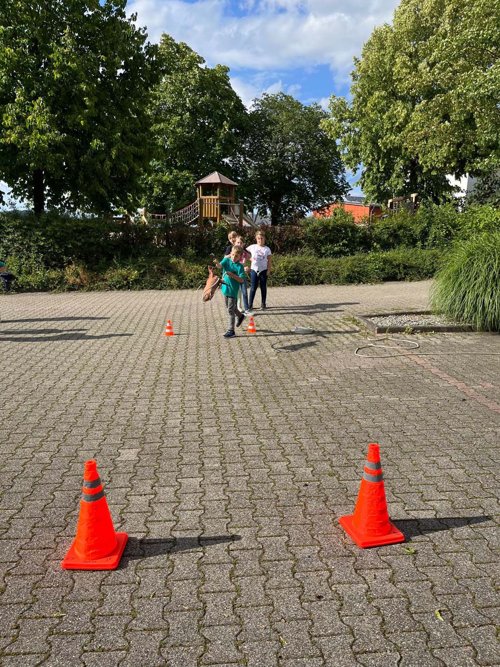 Danach konnte sich die Kids noch am Leinenbeutel-Zielwurf versuchen. Nach 1-2 Versuchen hatten sie den Dreh raus und der Beutel landete hinter der Markierung.
