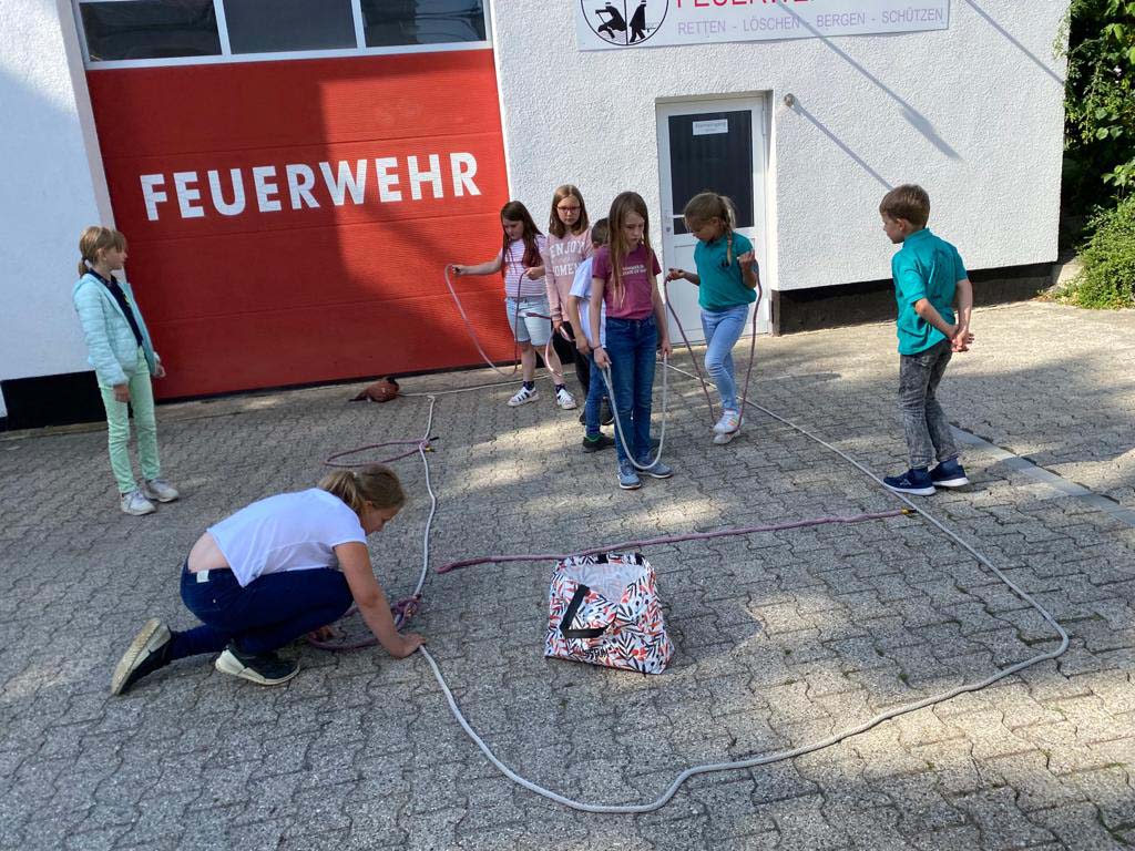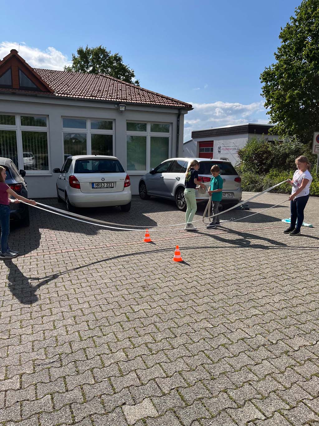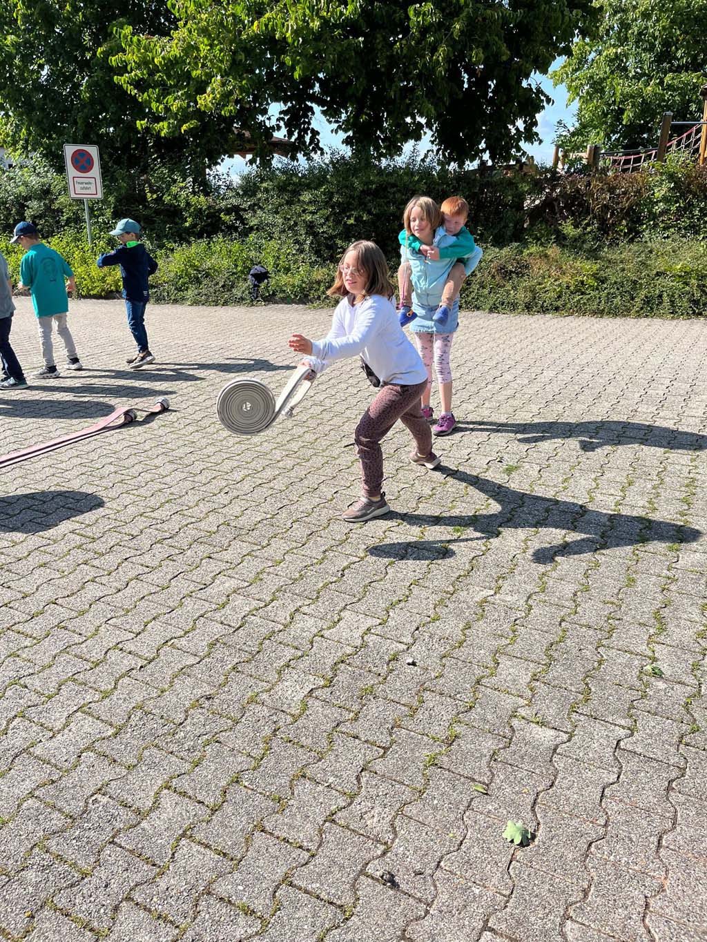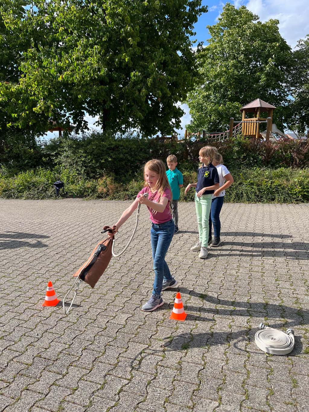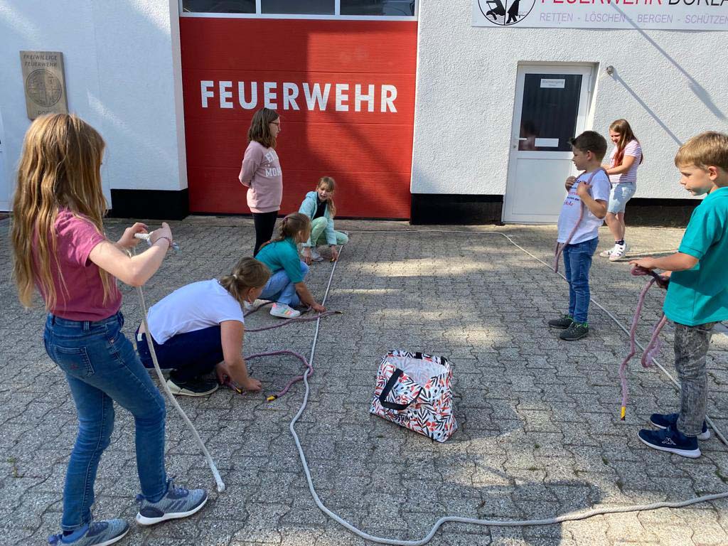 An der nächsten Station drehte sich alles ums Thema Schläuche. Hier wissen unsere Feuerlöwen schon super Bescheid, so dass wir schnell zum praktischen Teil übergehen konnten. Es galt einen D-Schlauch möglichst gerade durch zwei Hütchen auszurollen. Hier zeigten sich einige Talente. Die Schläuche wurden exakt gerade ausgerollt. Da haben die Betreuerinnen nicht schlecht gestaunt.