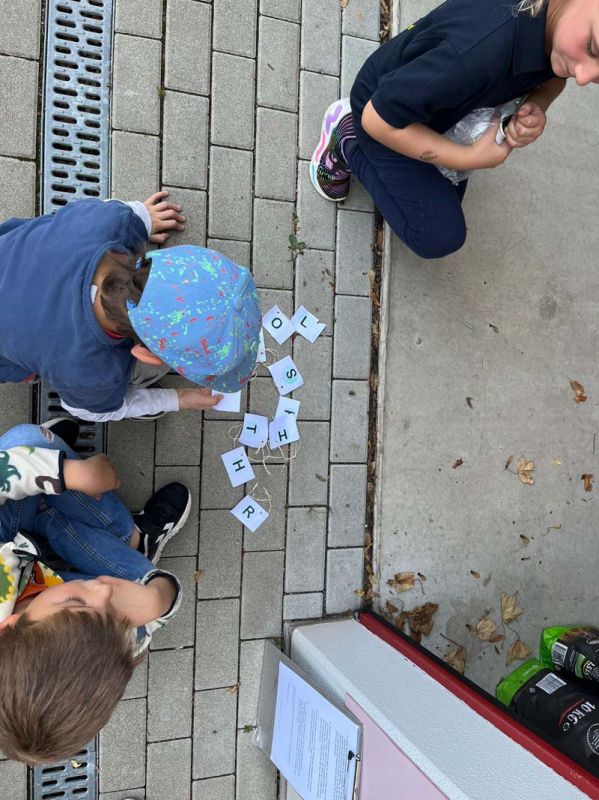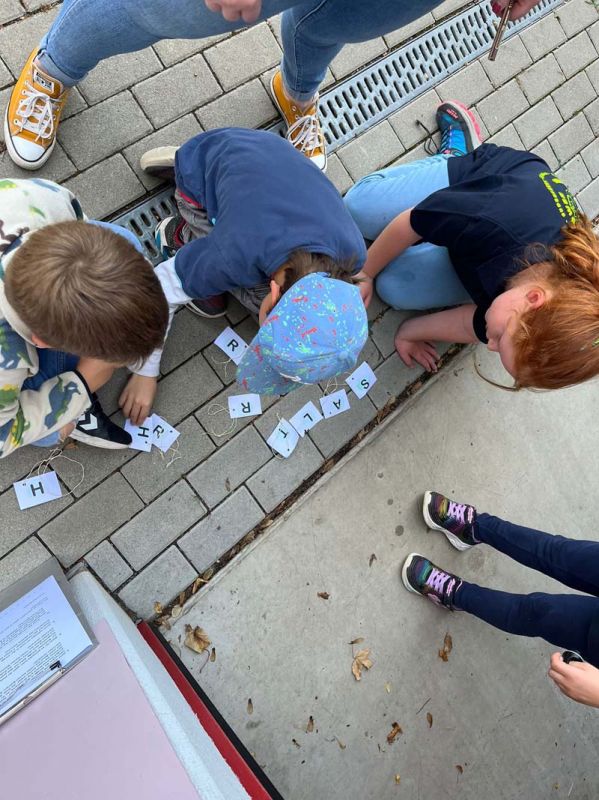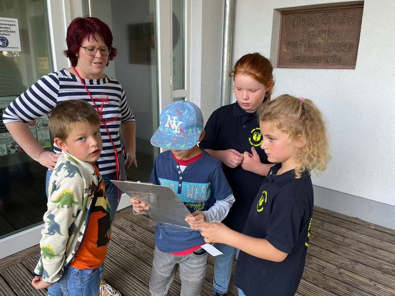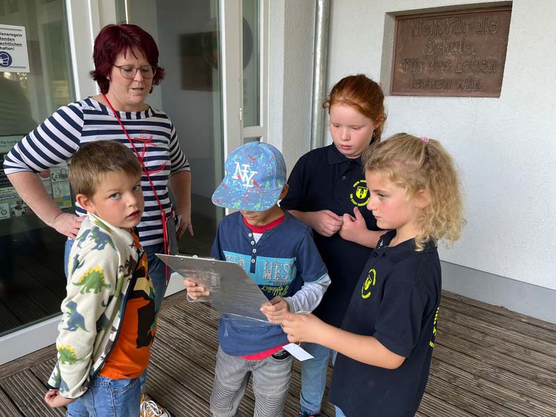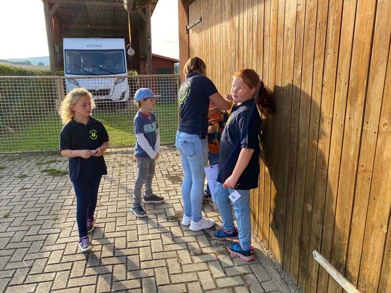 Aufgeteilt in zwei Gruppen zogen die Kinder und Betreuerinnen zu einer Dorfrallye los. Anhand einer genauen Weg- und Ortsbeschreibung musste man insgesamt zehn Punkte im Dorf ansteuern. An diesen Punkten befanden sich etwas versteckt Kärtchen mit einem Buchstaben, die man einsammeln musste. Lerneffekt war dabei das genaue Befolgen des beschriebenen Weges mit den entsprechenden Richtungsangaben.