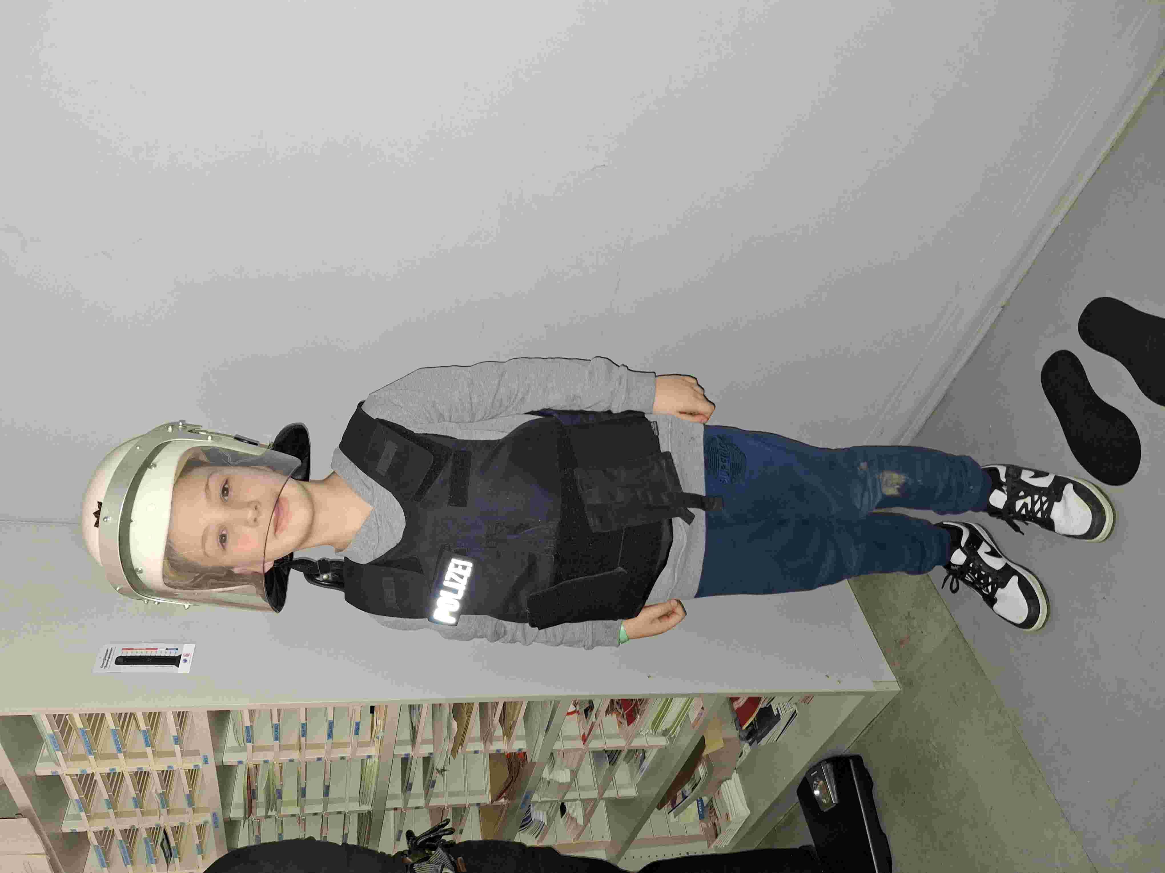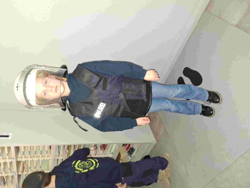 Die Schutzweste und den Helm konnte, wer wollte mal zur Probe tragen… wie cool.