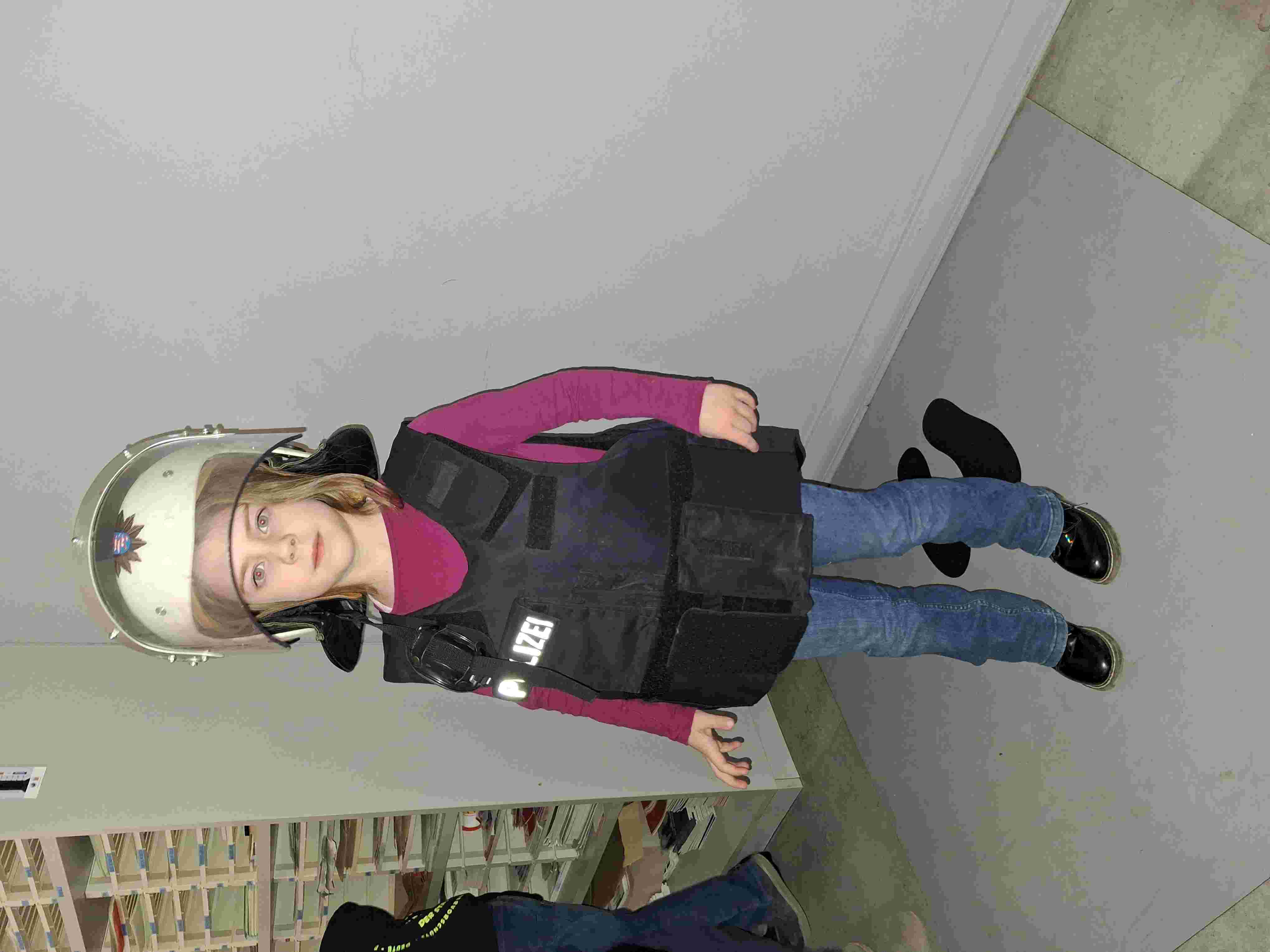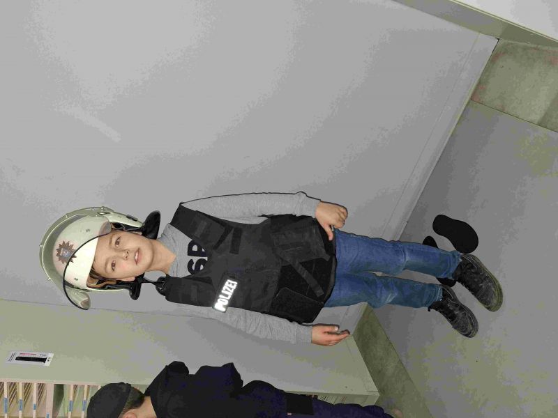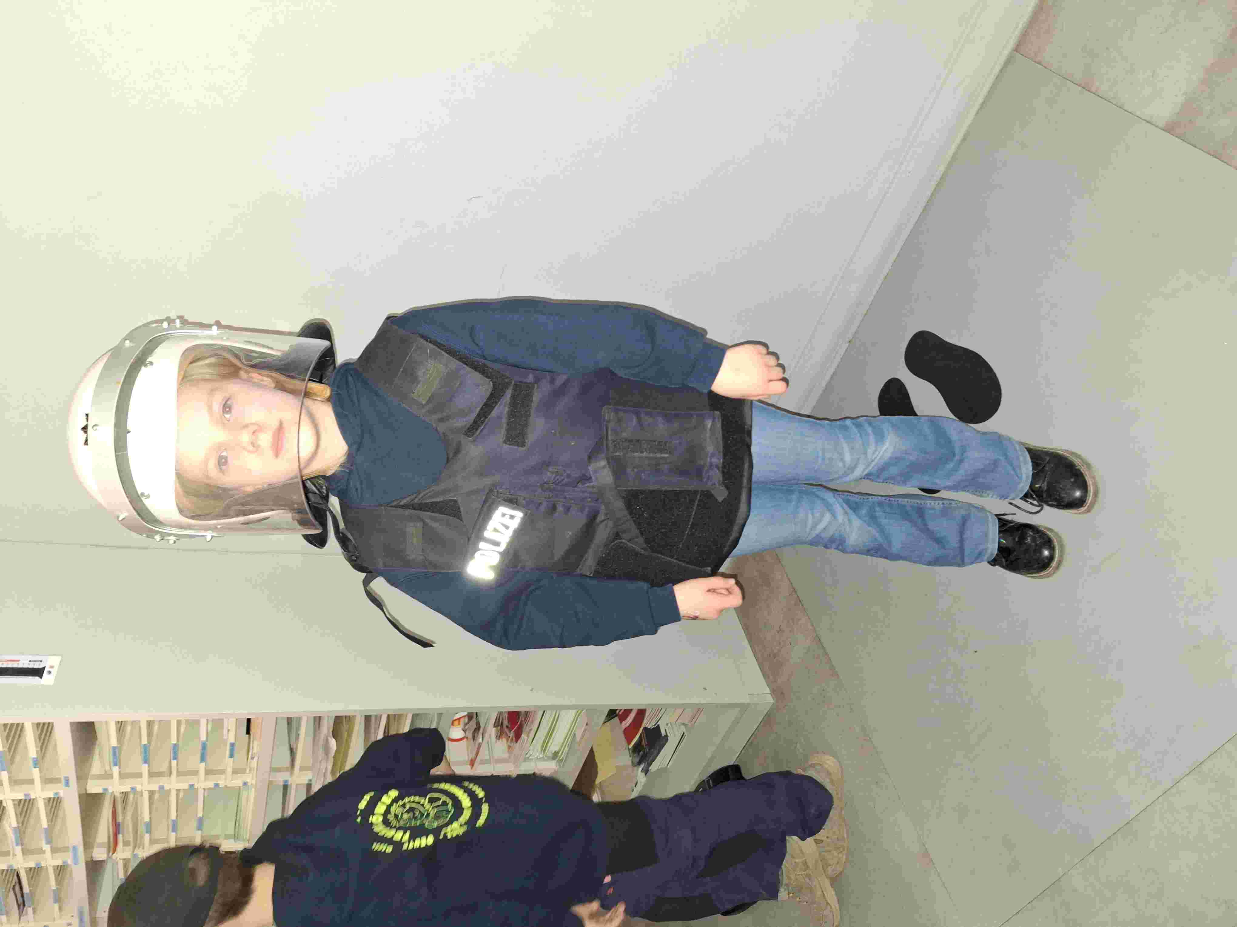 Wir schauten uns die Polizei Schutzkleidung mit ihrem ganzen Zubehör an… sehr beeindruckend auch die Waffe.