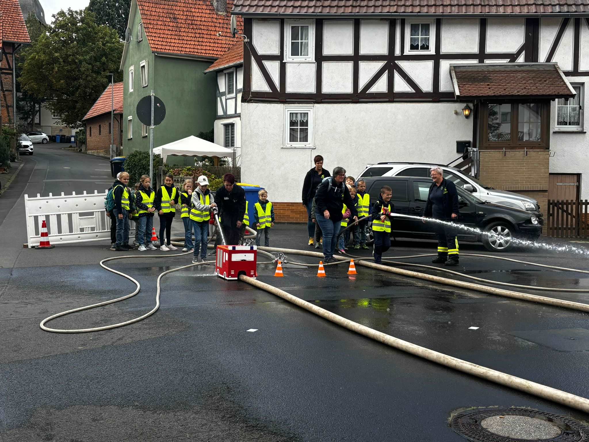 Angetrieben mit Wasser und Druck aus dem Strahlrohr sausten die Fahrzeuge über den Schlauch ins Ziel, die Eltern fieberten und jubelten eifrig mit.