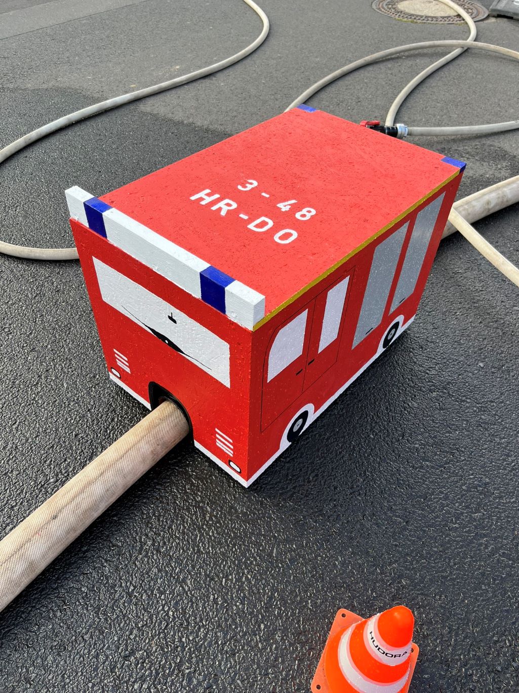 Wenn unsere Feuerlöwen nun mit einem Feuerwehrschlauch Wasser auf die Autos spritzen, flitzen sie auf einem mit Wasser gefüllten Schlauch davon. So bringt das neue Spielgerät nicht nur jede Menge Spaß, sondern vermittelt gleich noch spielerisch ein wenig Feuerwehrtechnik.