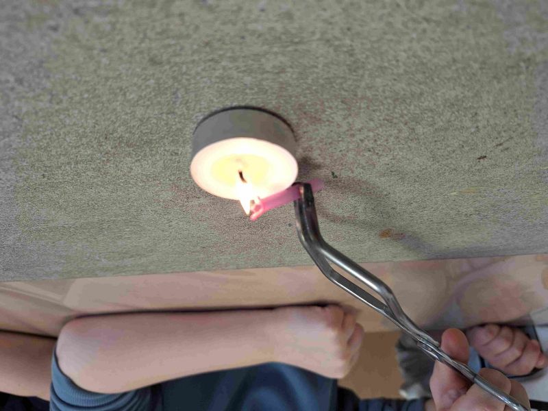Streichhölzer, Teelicht, feuerfeste Unterlage, viele kleine Gegenstände, eine Tiegelzange und selbstverständlich Löschwasser…
