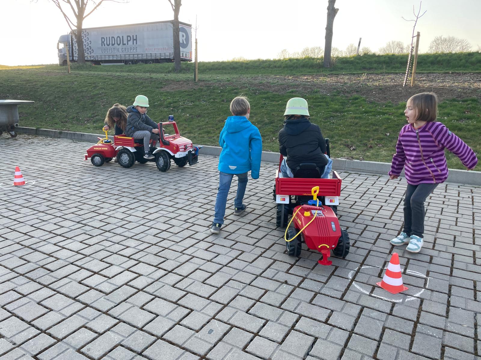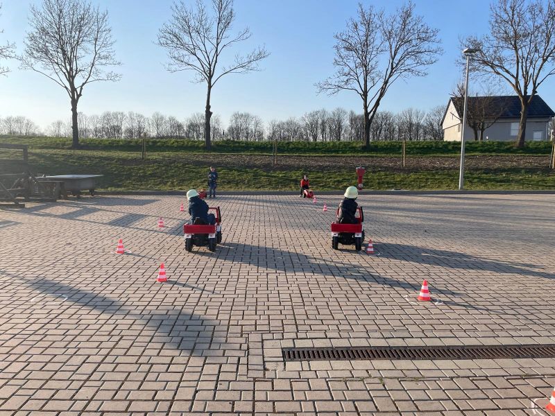 Durch den Parcours um die Pylonen, Löschanhänger ankuppeln und wieder zurück, alles sogar mit einem Helm der Einsatzabteilung.