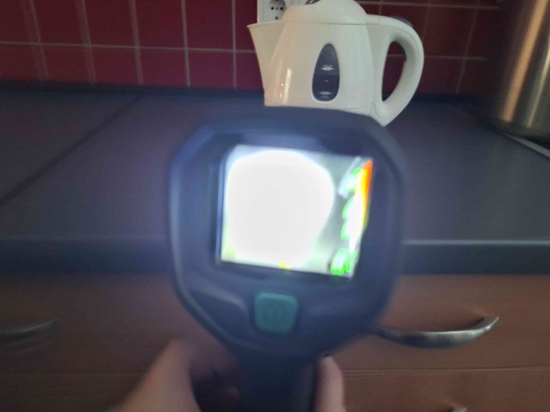 Wasserkocher, Ladekabelstecker, Kerze, Brennpaste und ein Waffeleisen, glühten förmlich vor sich hin… Die Gradzahl wird in der Kamera mit angezeigt und alle staunten, wie heiß diese Gegenstände werden können.