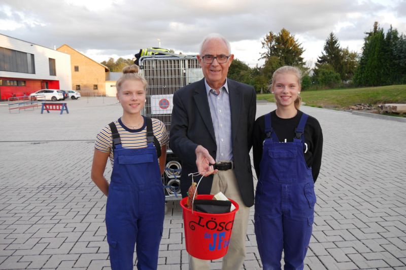 Die Jugendlichen überreichten Herrn Kaufmann zum Abschluss noch einen Löscheimer mit auserwählten Lebensmittelprodukten aus der Region Gudensberg