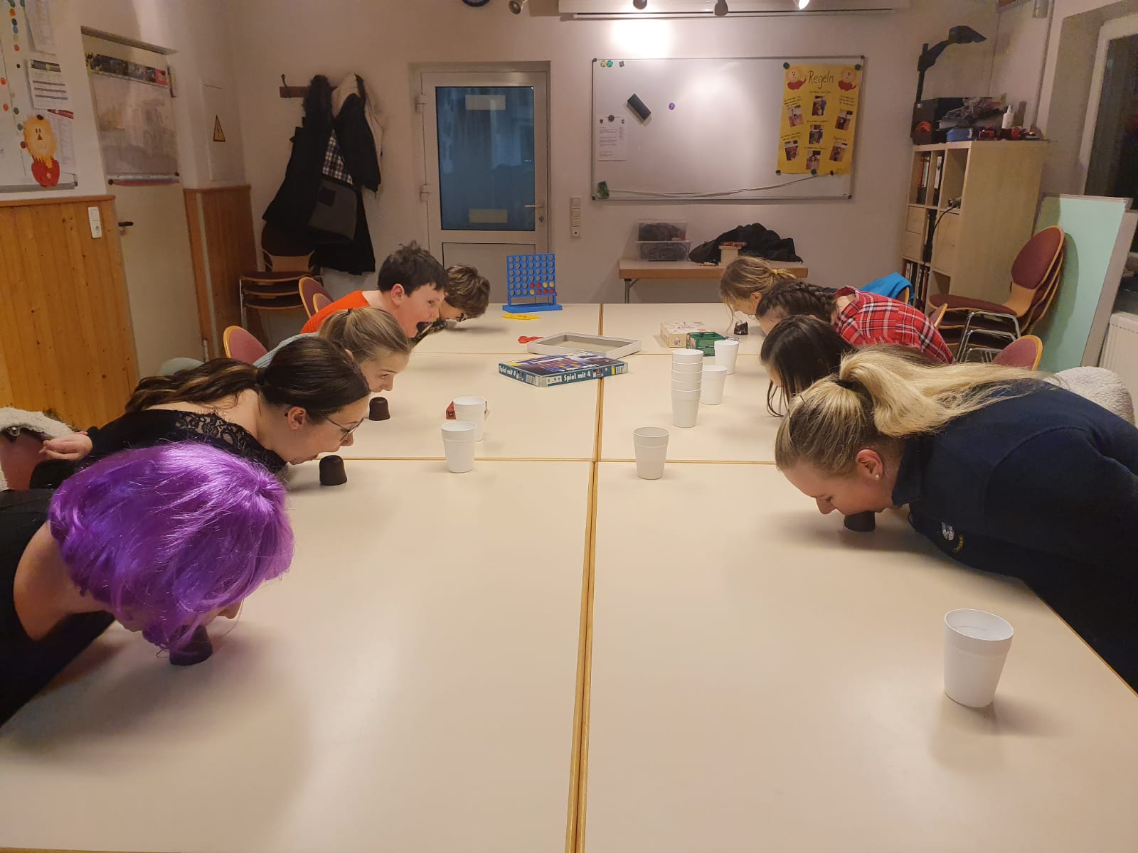 Zunächst überraschten die Betreuer Romina Stork und Tanja Völske die Jugendlichen mit einem Schaumkuss-Wettessen. Sie waren als erstes sehr verdutzt darüber, nahmen dann aber die Herausforderung an.