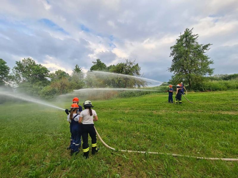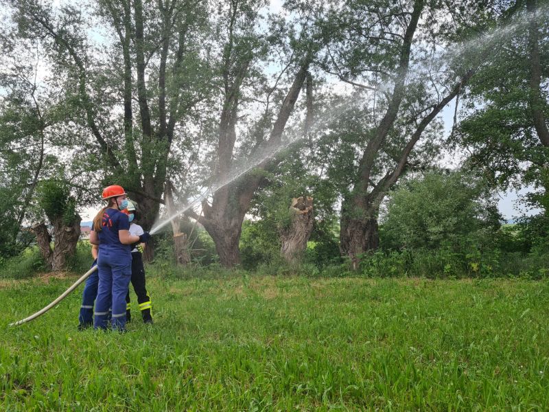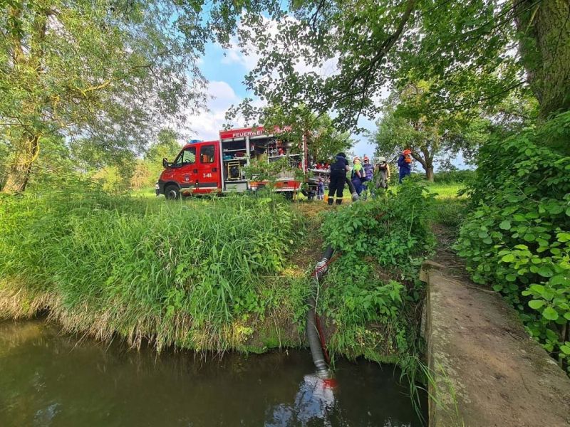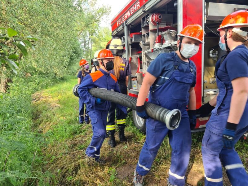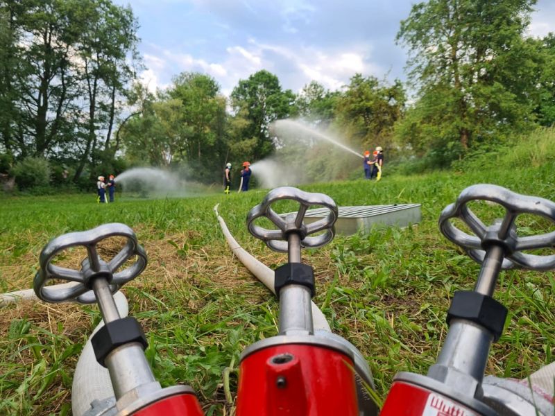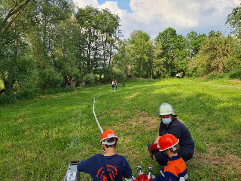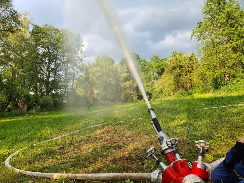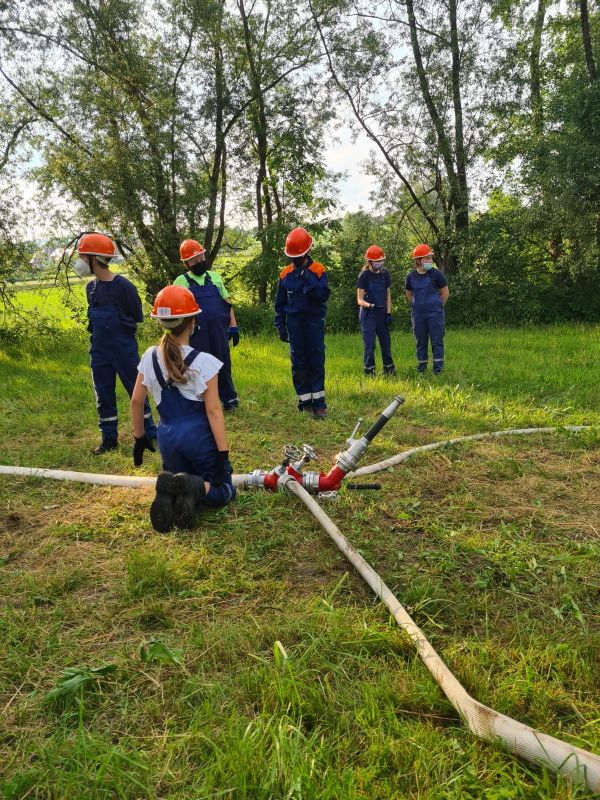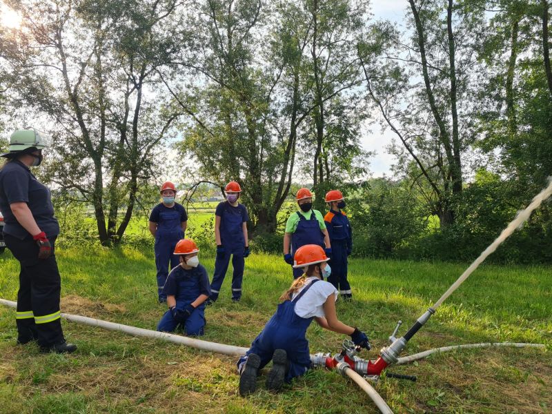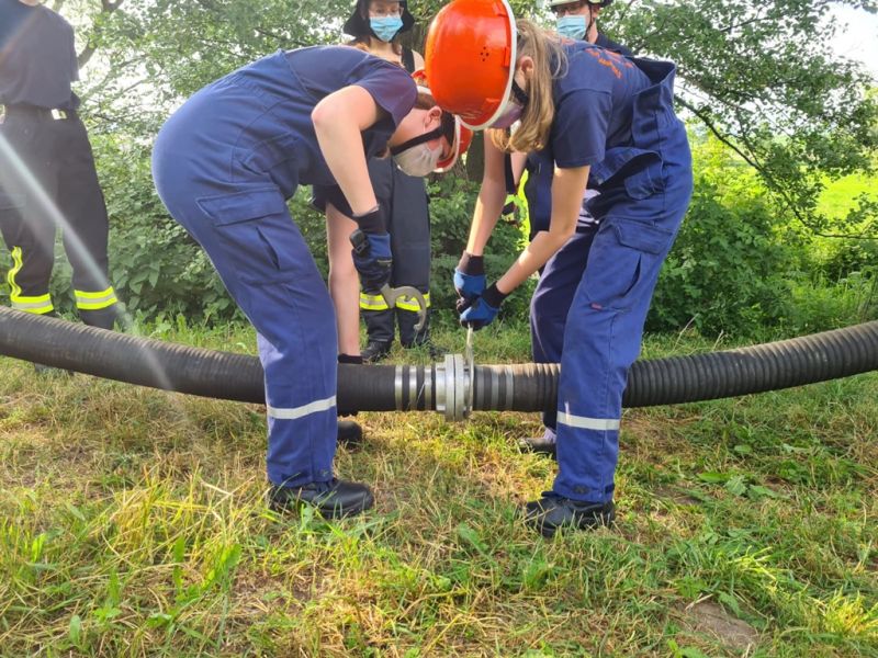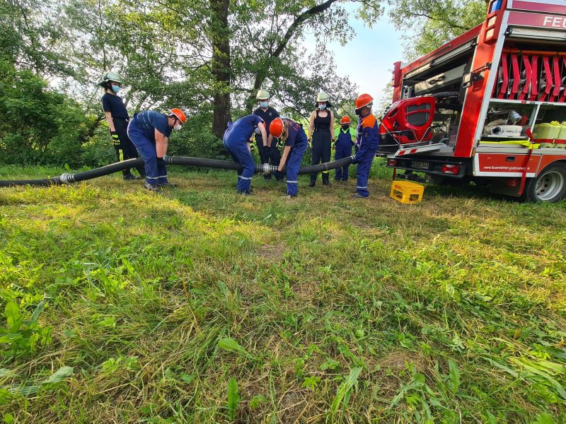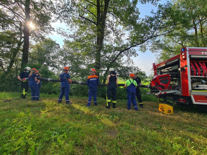 "Wasserentnahme offenen Gewässer" stand am vergangenen Mittwoch auf dem Plan. Dazu haben wir an die Ems gefahren. Dort haben wir das Auslegen, das Kuppeln, das Leinen und das zu Wasser bringen der Saugleitung geübt. Natürlich auch das Ansaugen des Wassers und natürlich die Wasserabgabe, was bei den Temperaturen für etwas Abkühlung sorgte.