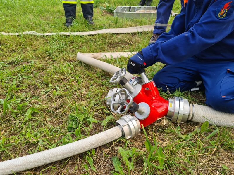 Der Aufbau eines provisorischen Wasserwerfers mit einem B-Rohr wurde bei dieser Ausbildungseinheit ebenfalls geübt.
