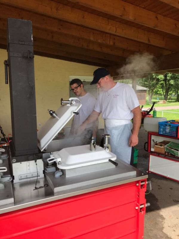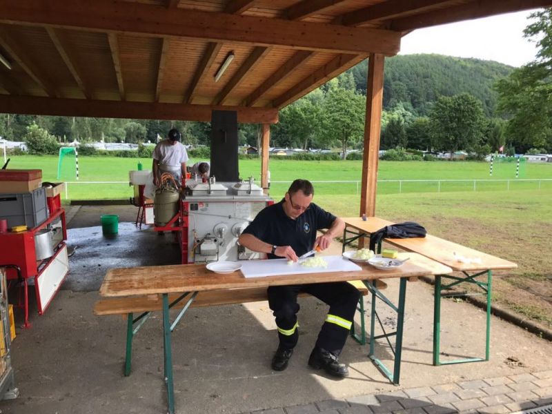 In dem kleinen Zeltdorf war in der Zeit Ruhe eingekehrt und das Team der Feldküche machte sich an die Arbeit um das Mittagessen vorzubereiten. Eine beachtliche Leistung schaffte das Team, denn 10 Kilo Nudeln und die dazugehörige Bolognese mit 12 Kilo Hackfleisch mussten zubereitet werden, bevor beide Gruppen zurück in das Lager kehrten.