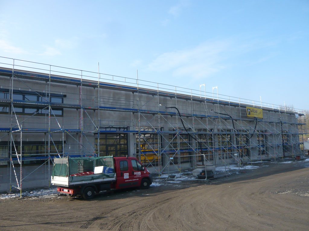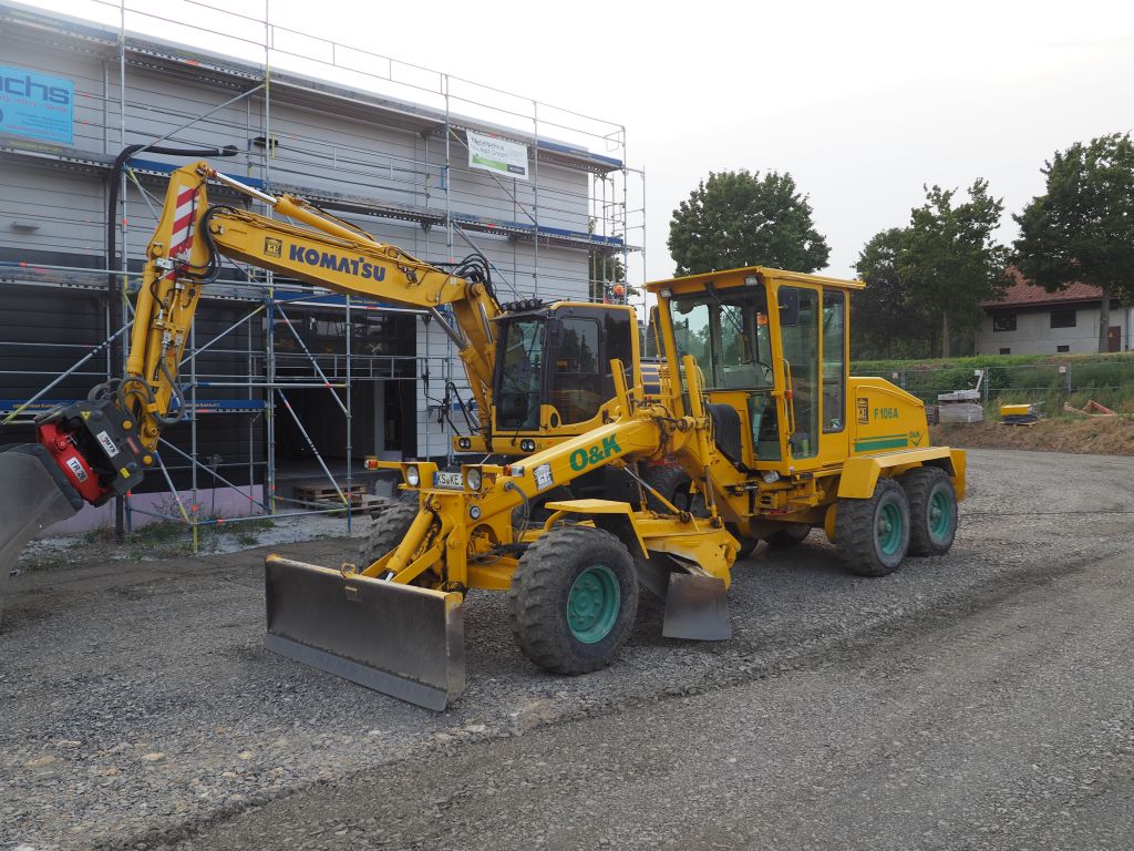 Nach der endgültigen Fertigstellung der Fassade, konnte das Baugerüst nach und nach abgebaut werden und die, mit der Außenanlage beauftragte Firma, konnte ungehindert mit ihren weiteren Erdbewegungen beginnen.