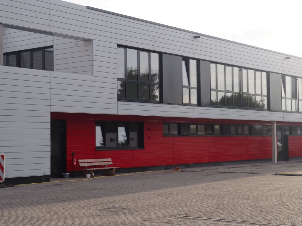 So ist inzwischen die Fassade an dem Gebäudekomplex angebracht. Als Schnittstelle zwischen Innen- und Außenraum gibt sie dem neuen Feuerwehrhaus ein Gesicht und lässt es bereits jetzt in seinem Glanz erstrahlen.