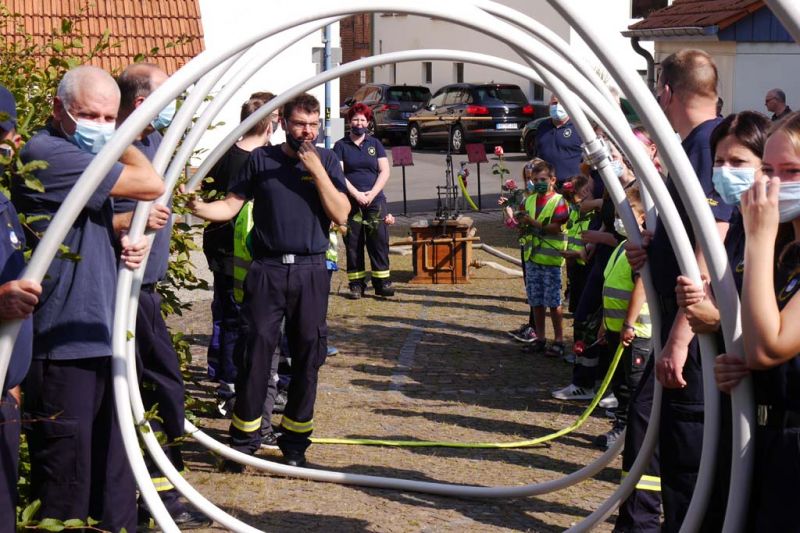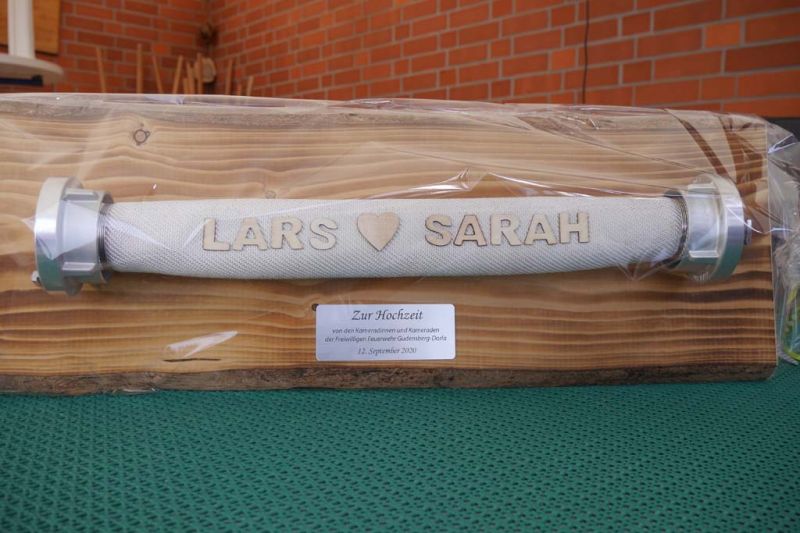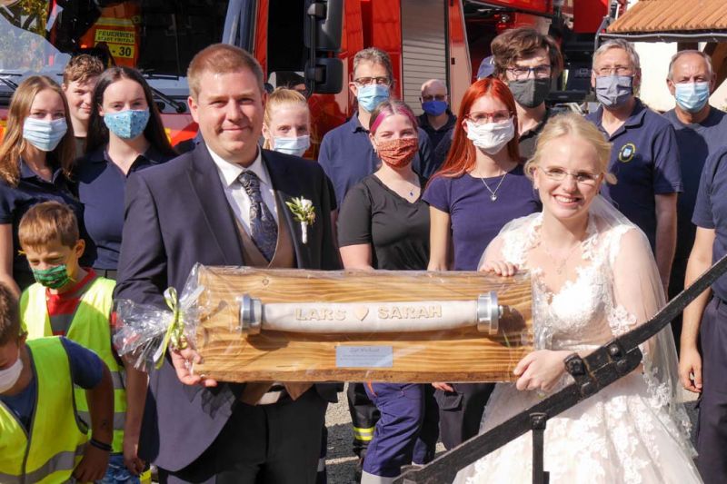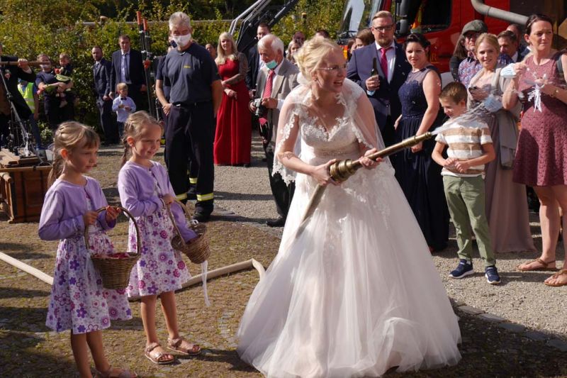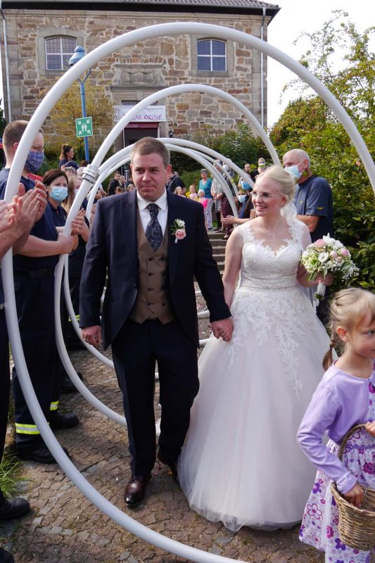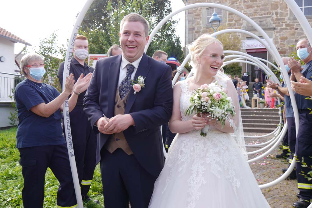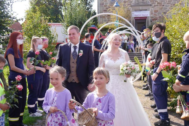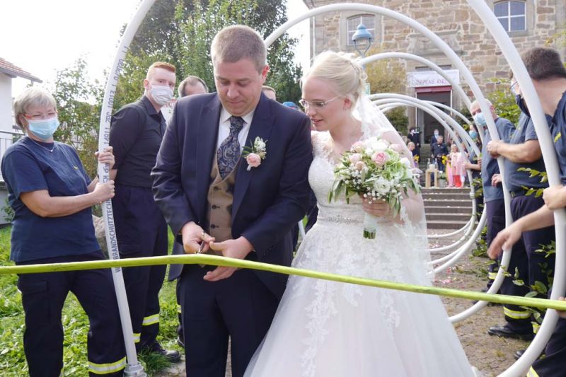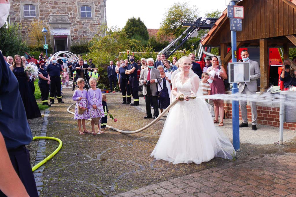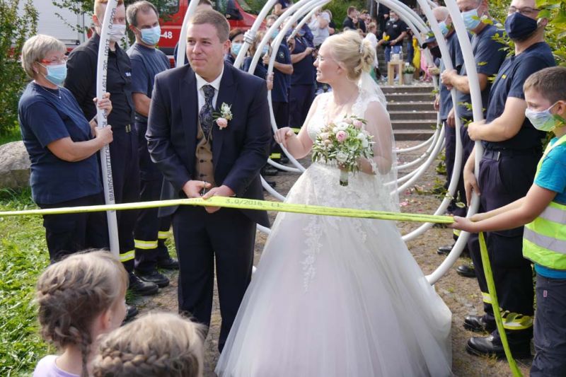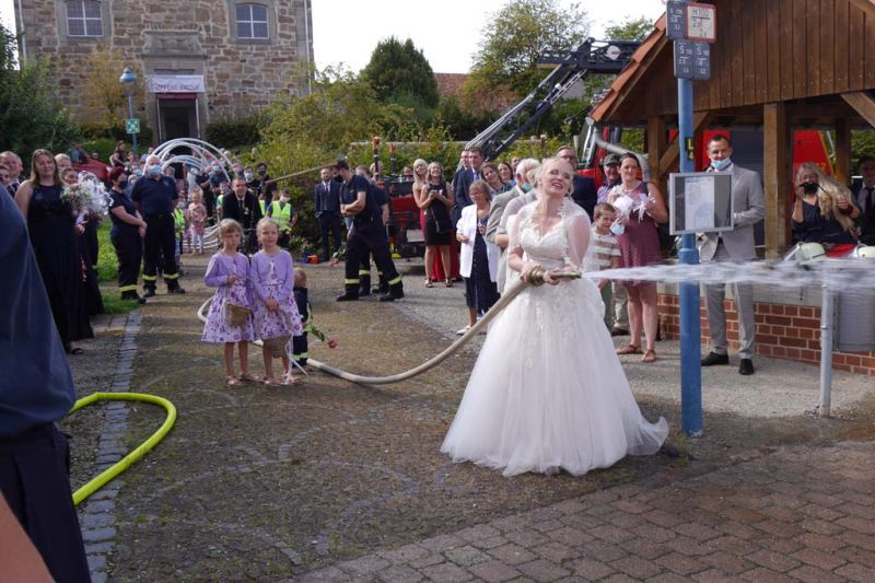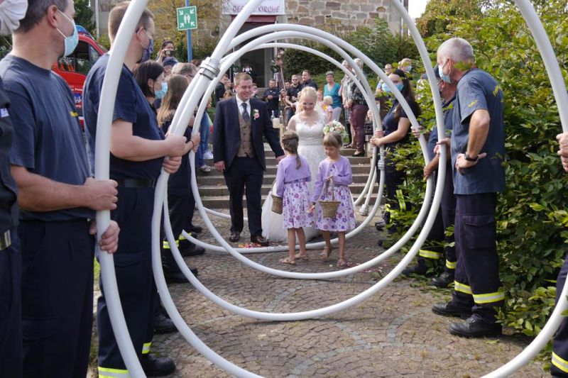 Nicht nur für Sarah und Lars, auch für die Feuerwehren aus Dorla und Lohne war diese Hochzeit ein besonderes Ereignis. So hatten viele Feuerwehrkameradinnen und -kameraden, von den jüngsten Mitgliedern der Kindergruppe bis zu den Mitgliedern der Einsatzabteilung, nach der Trauung ein Schlauch-Tunnel-Spalier gebildet, durch das die frisch Vermählten freudestrahlend hindurchgingen.