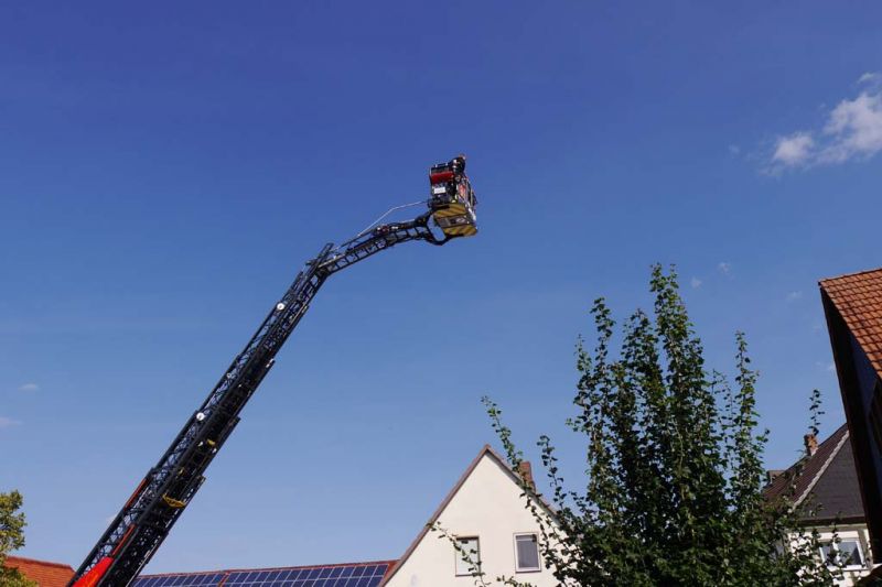 Zum Abschluss mussten vom Brautpaar verschiedene Aufgaben gelöst werden. So galt es einen Schlauch zu zerschneiden, mit der Spritze von 1848 aus Dorla einige Fallklappen umzuspritzen, bevor beide den Korb der neuen Fritzlarer Drehleiter bestiegen und in dieser zu einem Blick über Lohne fahren durften.