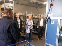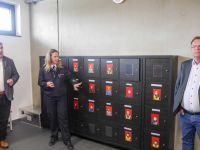Hier besichtigte er zusammen mit Stadtbrandinspektor Markus Iffert, der stv. Stadtbrandinspektorin Katrin Möbus, Wehrführer Christoph Hiebsch, Bürgermeisterin Sina Best und Landrat Winfried Becker den Neubau des Feuerwehrhauses, der 2018 fertiggestellt und eingeweiht wurde. Der Rundgang durch das Haus führte über die Umkleideräume der Einsatzkräfte, der Schlauchwerkstatt mit der Vollautomatischen Schlauchwasch, -Druckprüf- und Trocknungsanlage zur Atemschutzwerkstatt. Von hier ging es weiter in die Fahrzeughallen und zum Funk- und Stabsraum. Im Obergeschoss wurden die zwei Lehrräume besichtigt und der Gemeinschaftsraum bildete den Schluss des Rundganges.