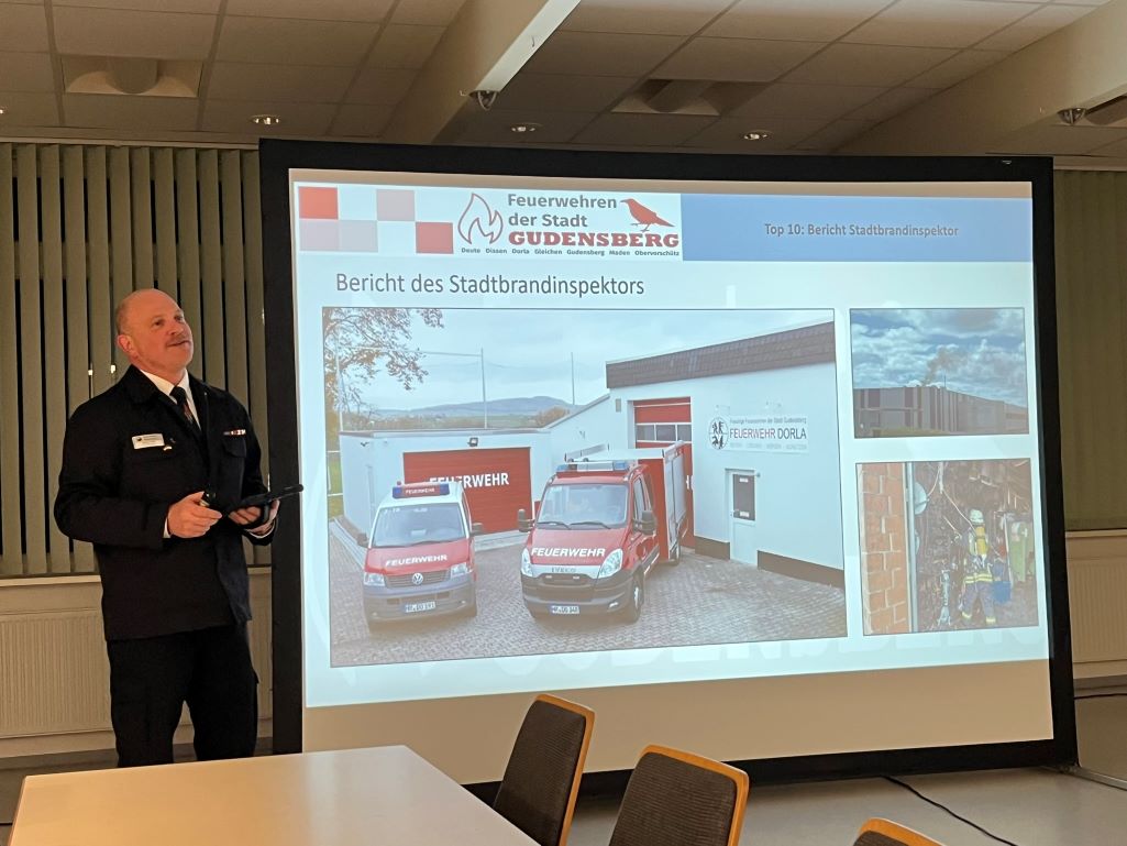 Stadtbrandinspektor Markus Iffert lobte den guten Ausbildungsstand der Feuerwehr und die hervorragende Jugendarbeit. Er berichtete über die gemeinsamen Ausbildungen auf Stadtebene sowie im Katastrophenschutz und dem Einsatz des neuen GW-L KatS, welches seit letztem Jahr in Gudensberg stationiert ist. Auch auf die neue Drehleiter ging er kurz ein und lud zur offiziellen Übergabe ein. Des Weiteren berichtete er, dass für die Atemschutzgeräteträger neue Schutzkleidung angeschafft wird und dass er sich dafür einsetzen will, dass alle Feuerwehrhäuser im Stadtgebiet ein System zur Brandfrüherkennung erhalten.