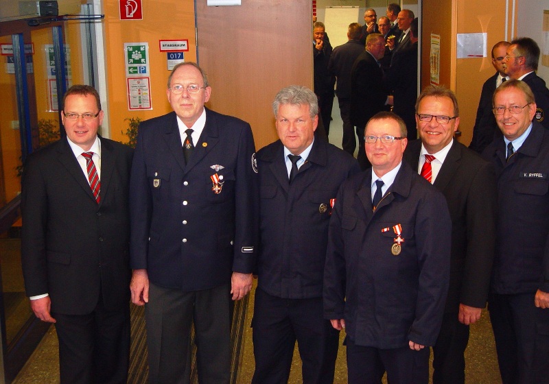 v.l.n.r. Bgm. Frank Börner, Manfred Jungermann, Willi Mildner, Bernd Knieling, Erste Kreisbeigeordnete Winfried Becker, SBI Verdy Ryffel