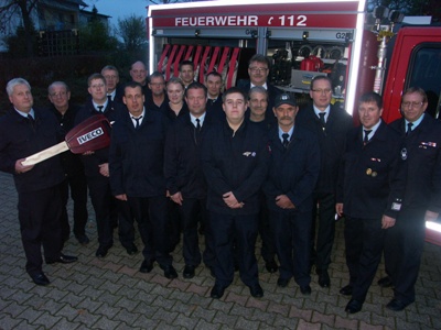 Wehrführer Frank Theis (1. Von links) und sein Stellvertreter Lars Völske (3. Von links) mit einem Teil Ihrer Mannschaft vor dem neuen Fahrzeug