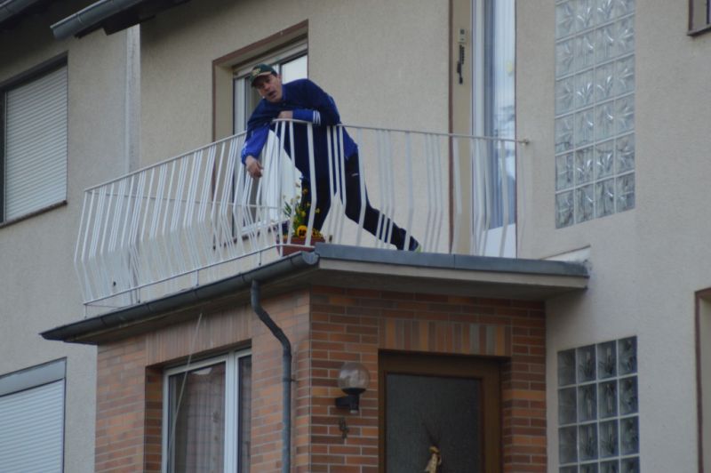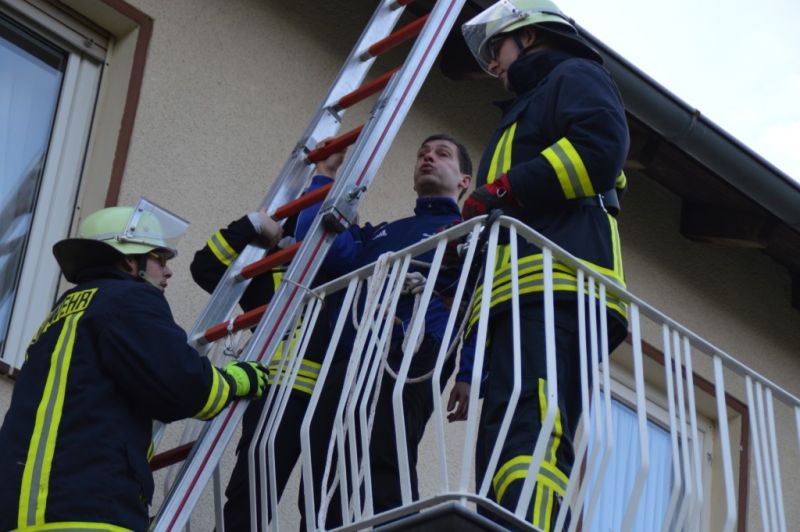 Der Keller wurde gelüftet und die Sachen wieder auf dem Feuerwehrauto verlastet. Zwischenzeitlich schrie auf einmal eine Hilflose Person (Reini) von einem Balkon eines Nachbar Gebäudes. Er konnte sich nicht mehr alleine runter begeben, da der Weg verschlossen war. Da, laut Übungsleistelle, keine Drehleiter verfügbar war, musste die Person über die Steckleiter gerettet werden. Dies gestalte sich natürlich auch schwierig, da die Person sehr verstört war. Im Ernstfall würde diese Rettung nur mit einer Drehleiter funktionieren!
