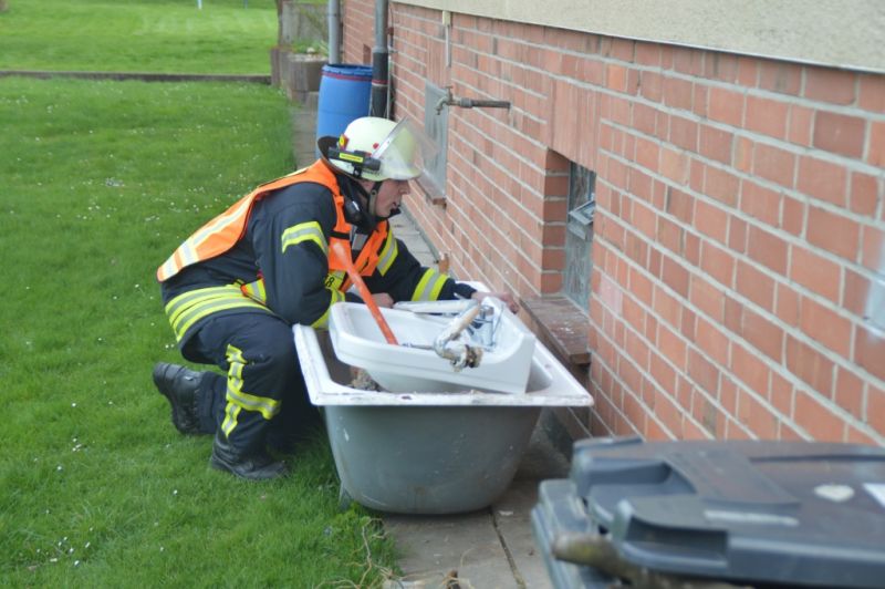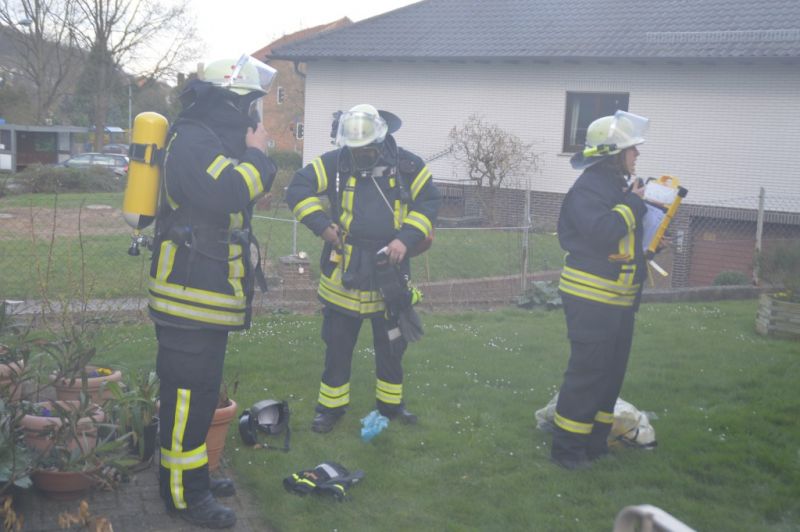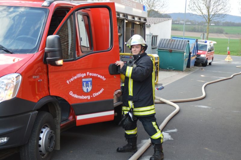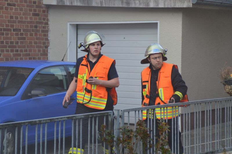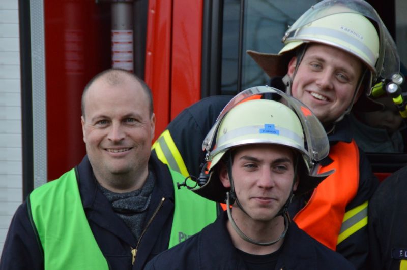 Als die Frau von anderen Feuerwehrkameraden, ja man muss schon sagen, von Daniel weg gehalten wurde, konnte er zusammen mit Björn Keidel, Fahrzeugführet Deute, die Lager erkunden, während sich die Kameraden beider Einsatzabteilungen schon mal mit Atemschutz zur Menschenrettung ausrüsteten. Den beiden stellte sich folgende Lage: