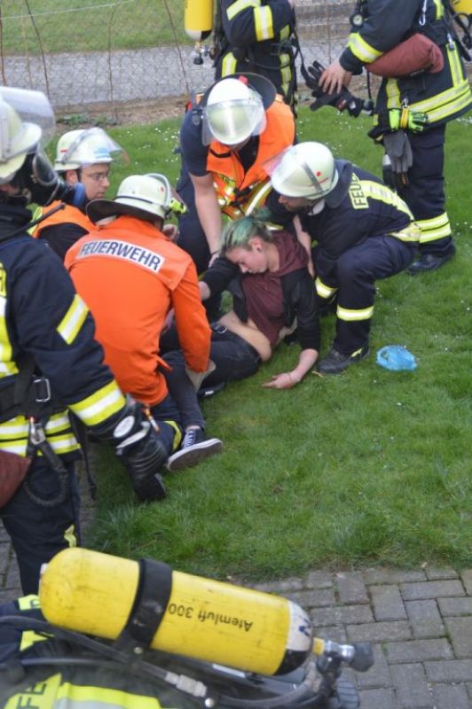 Beiden gaben Ihren Angriffstrupps die Aufträge Menschenrettung unter PA und ein weiterer Trupp rüstete sich als Rettungstrupp aus. Die Wasserversorgung wurde Parallel aufgebaut. Der Angriffstrupp fand die ersten von fünf verletzten Personen im Kellerbereich sehr schnell. Sie wurde nach draußen gebracht. Das stellte sich aber gar nicht so einfach dar, da sie wild um sich schlug und schrie. Dies hatte Nadine so täuschend echt gespielt, dass wir teilweise nicht mehr wussten ob es Spiel ist oder ob sie gerade in einer echten Notlage ist. Sie wurde von weiteren Kameraden zum Verletzten Sammelplatz gebracht, so dass der Angriffstrupp sofort weiter nach Personen suchen konnte. Dann fanden Sie Ole mit einem offenen Schienbeinbruch. Ole wimmerte nur leise vor sich hin und konnte auch keine Auskunft geben, wieviel Personen sich im Keller befinden. Auch er wurde zum Verletzten Sammelplatz gebracht.