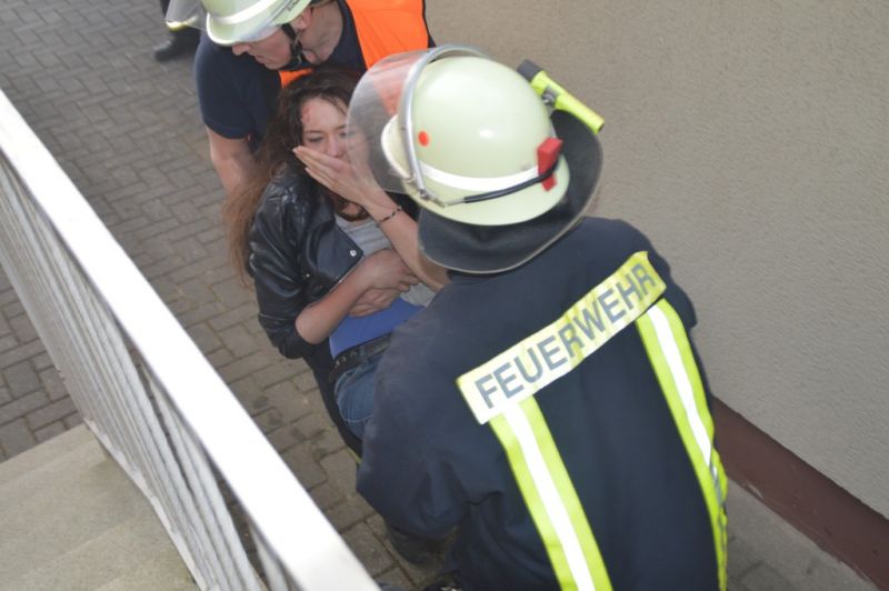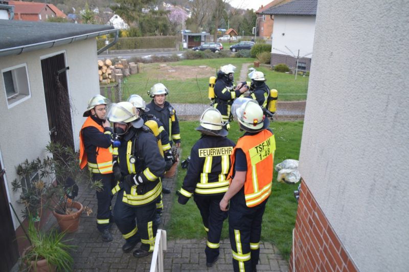 Kurz vor der Alarmierung um 18:14 Uhr wurde der Keller mittels einer Nebelmaschine verraucht und die Verletzten, bis auf die unter Schock stehende Mutter im Übungsobjekt platziert. Als die beiden TSF-W relativ zeitgleich an der Einsatzstelle eintrafen, wurden sie bereits sehnsüchtig von einer total unter Schock stehenden Frau erwartet. Die Knallte die Faust erst einmal so gegen die Fahrertür des TSF-W Dissen, das der Maschinist erstmal zusammenzuckte.