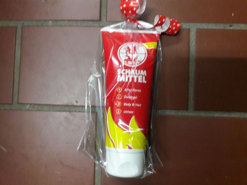 Für jeden gab es eine Tube " Schaummittel " als Dankeschön für die gute Zusammenarbeit.
