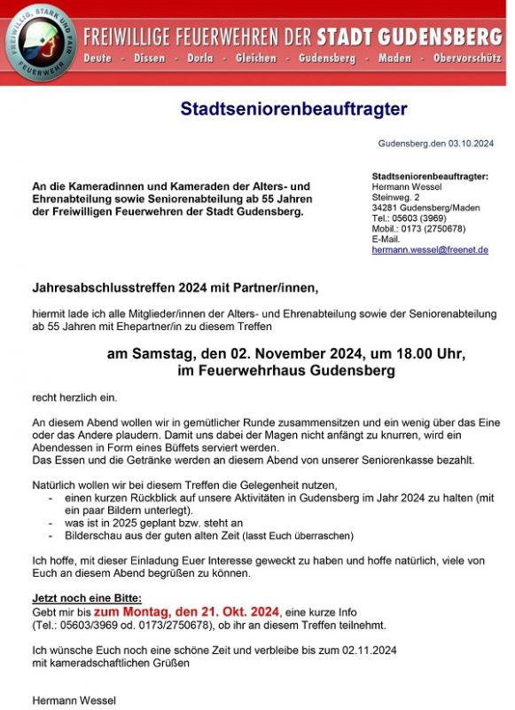 A- u. Ehrenabteilungen der Feuerwehren Gudensberg: Jahresabschlusstreffen 2024